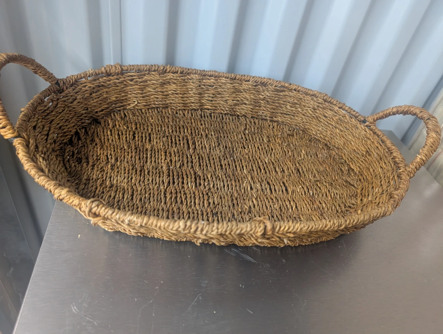 This oval basket is woven from natural seagrass. It features two sturdy handles for easy carrying. Its rustic design makes it a versatile piece for storage or display.