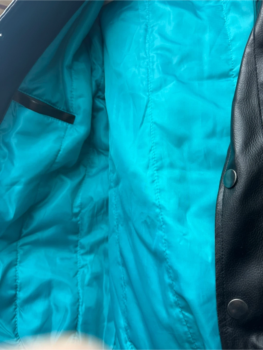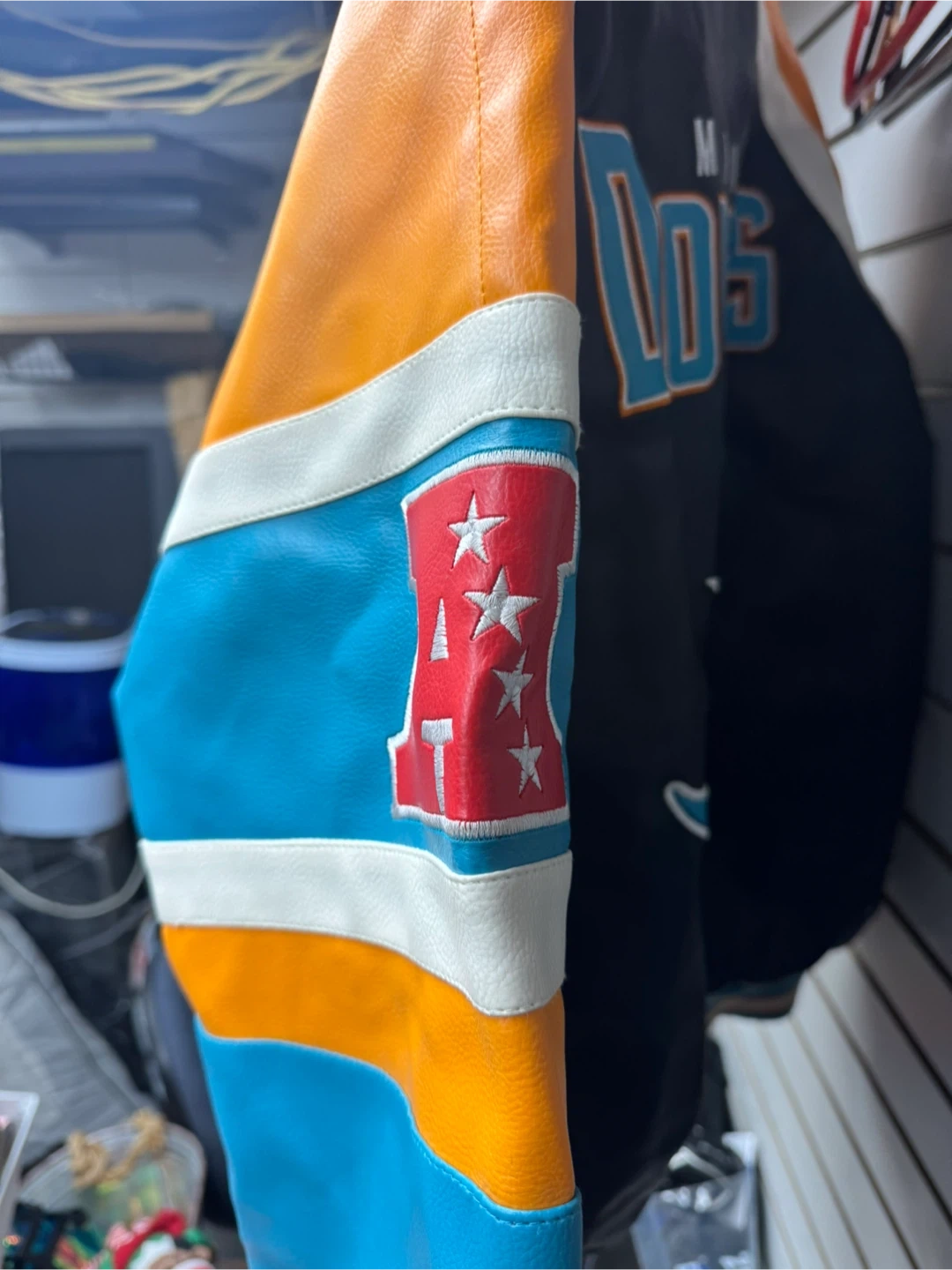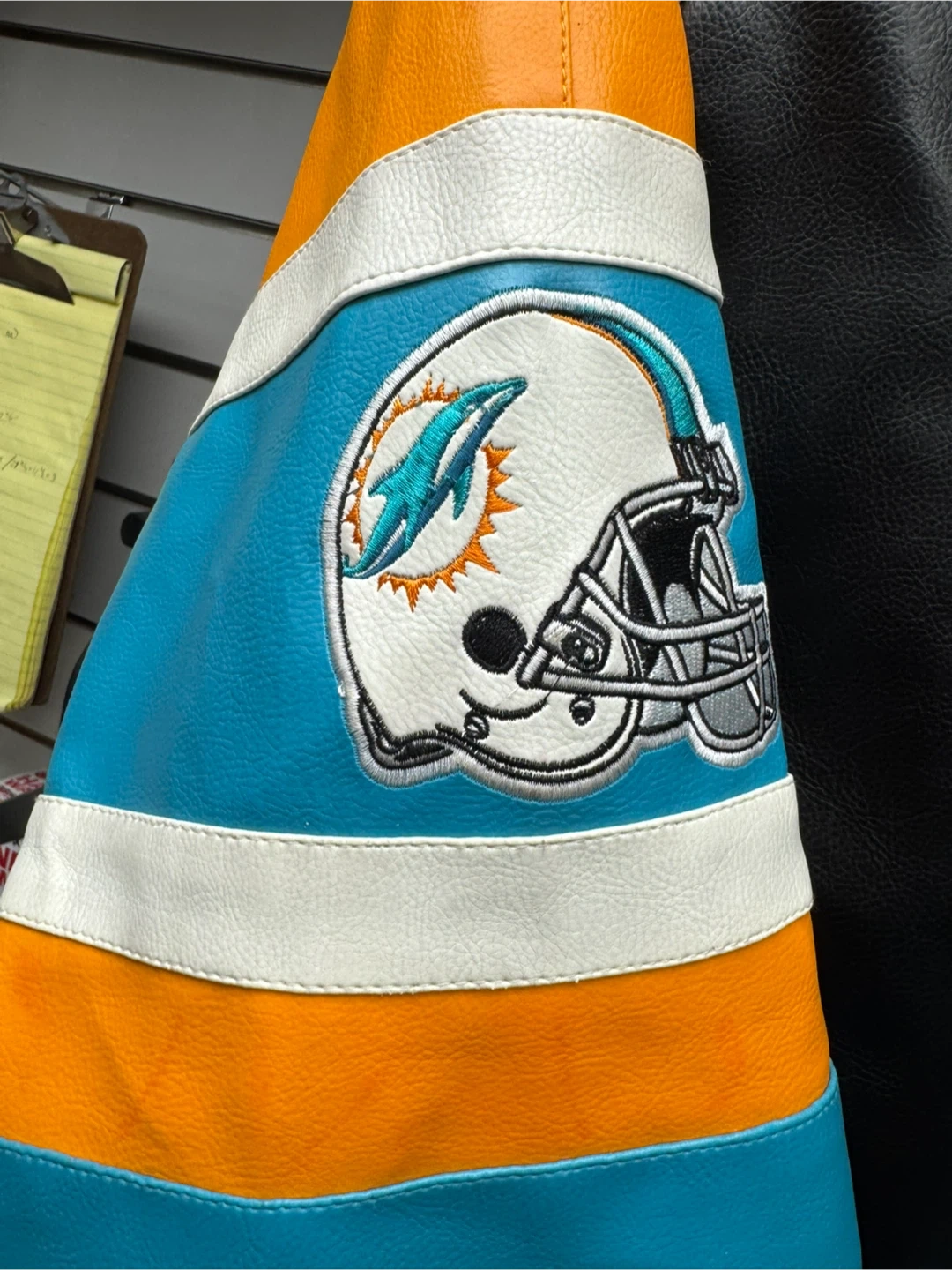 This is an official NFL Miami Dolphins letterman jacket. It's a size XL. Features team logo and colors on the front and back. Made from leather and fabric materials.