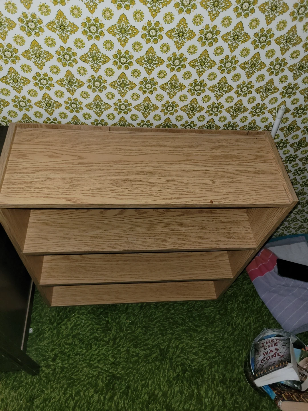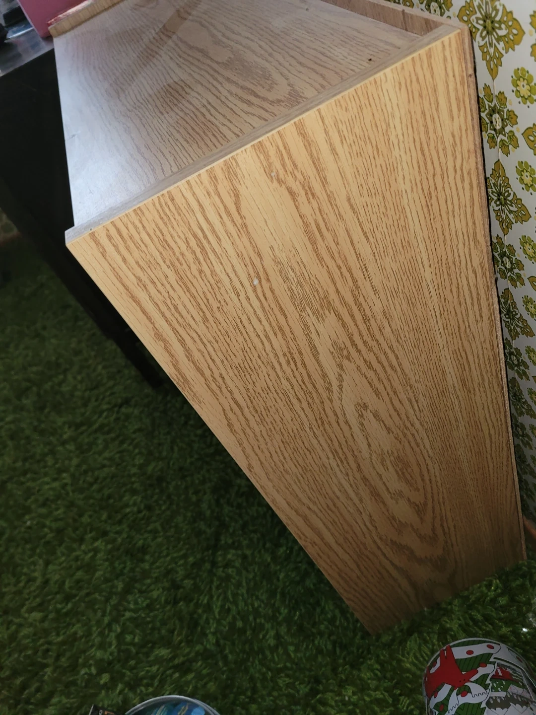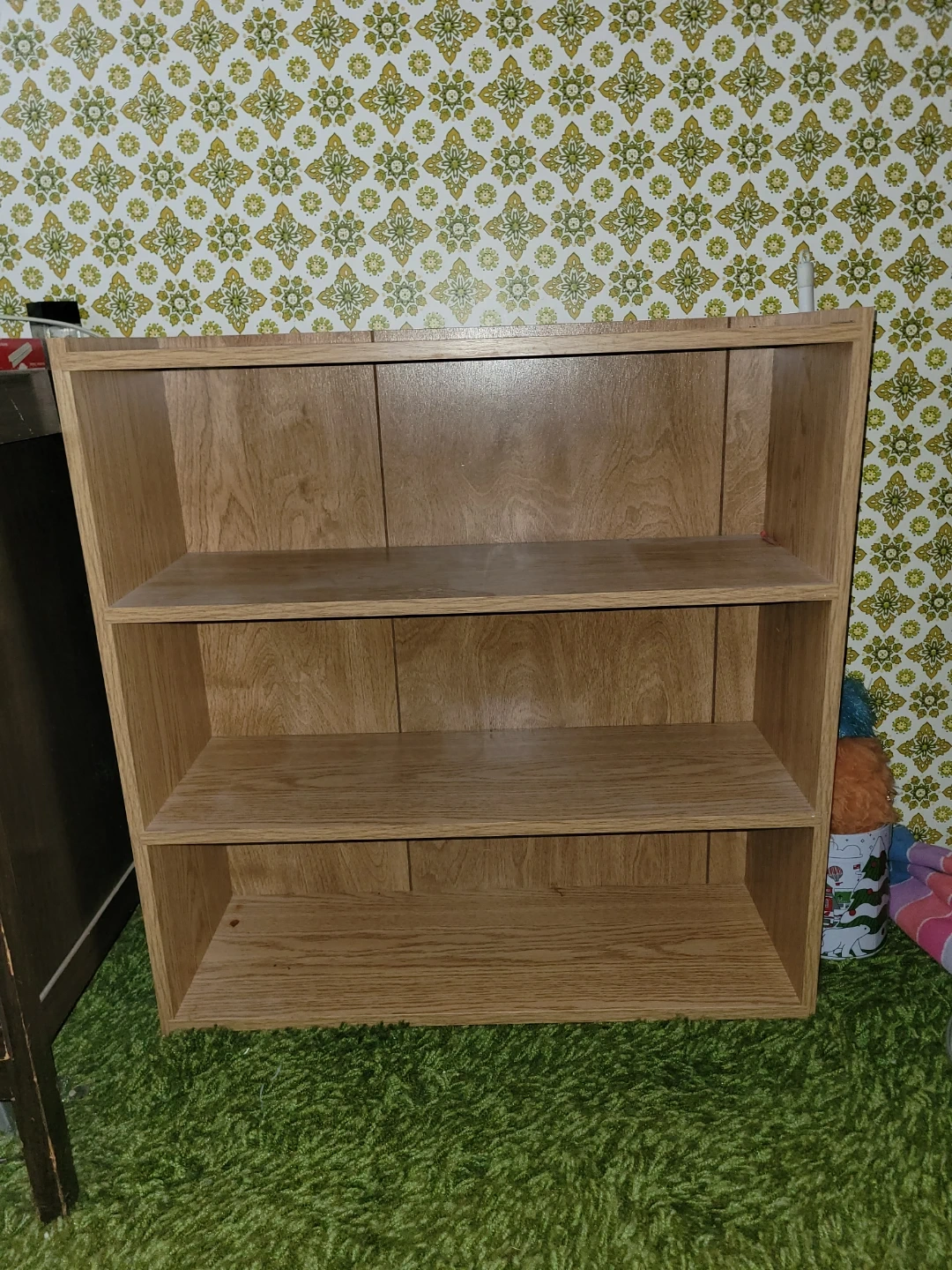 This is a compact bookcase with three shelves. It's made of a wood composite with an oak effect veneer. It's useful for storing books or displaying small items. It measures approximately 24 inches wide, 28 inches tall, and 12 inches deep.