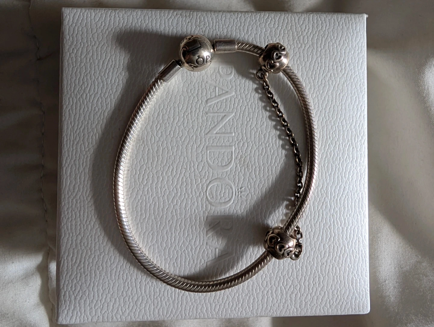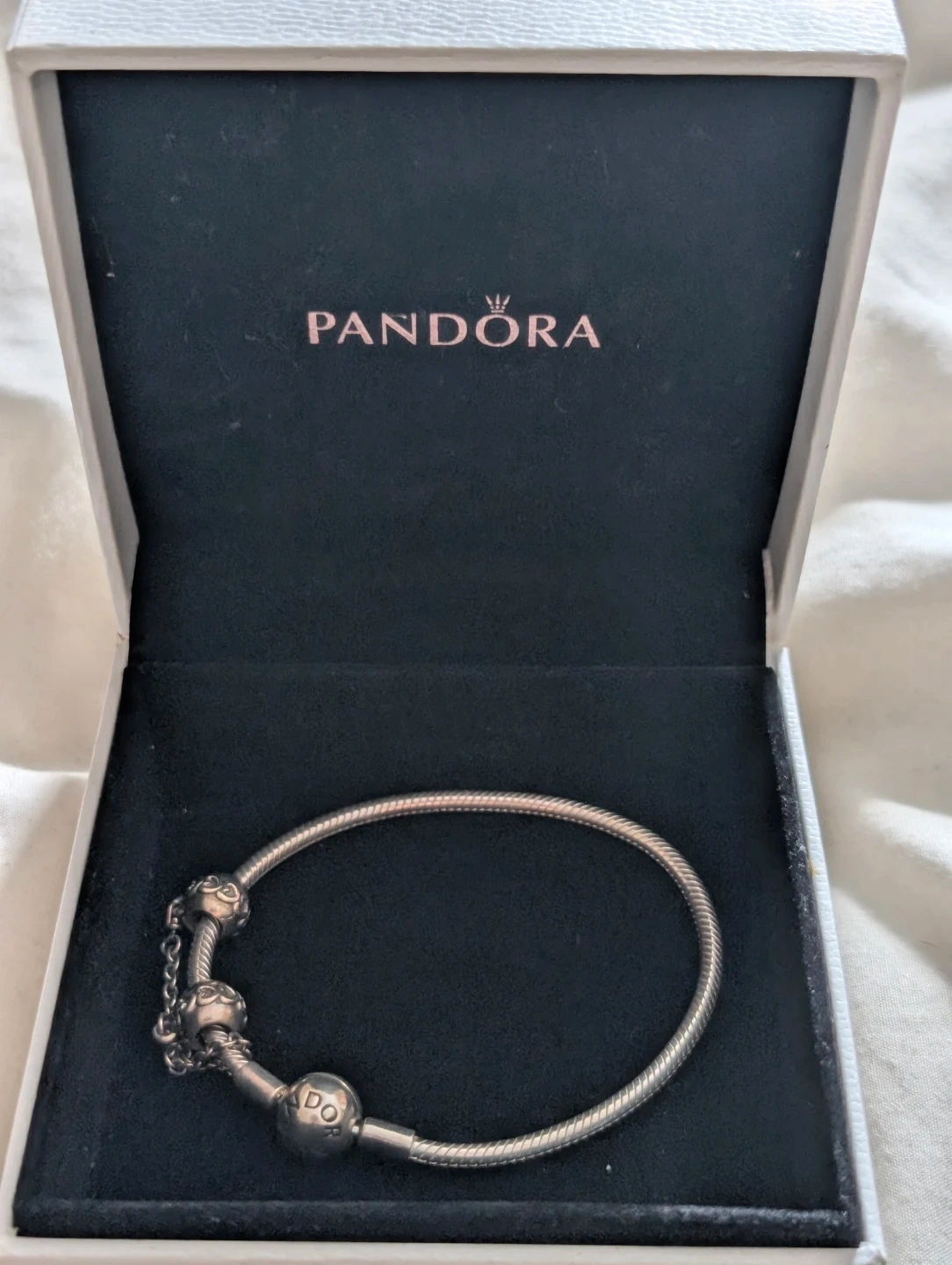 Pandora sterling silver snake chain bracelet (7.5 Inches) with safety chain. Includes original Pandora box. Great condition just needs shine. It's classic piece for everyday wear or special occasion. Also makes a beautiful gift.