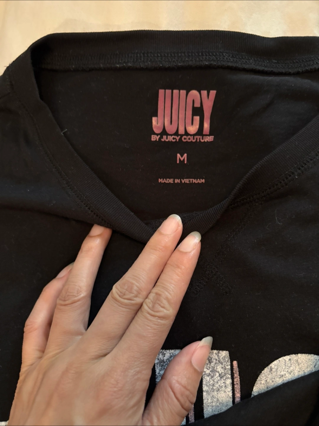 This is a black, long-sleeve oversized top from Juicy Couture. It's a size medium and made of 60% cotton and 40% polyester, very soft. The shirt features the Juicy California logo on the front. It's in great condition