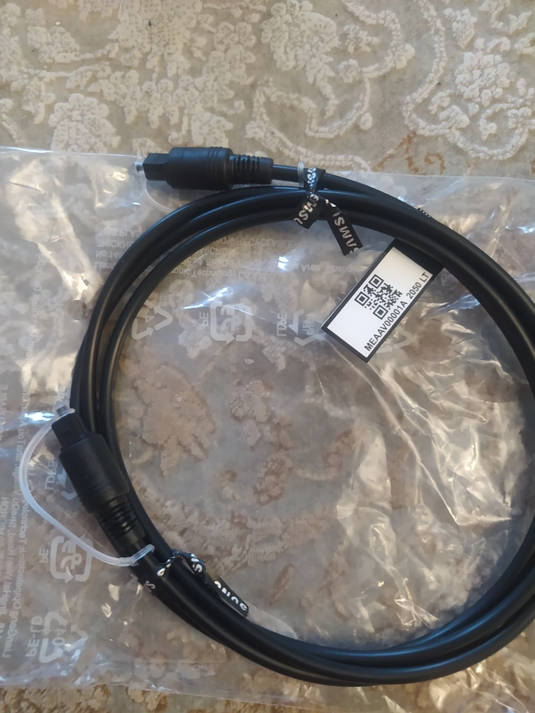 This is a Samsung optical audio cable. It's black and includes the original packaging. Connect your devices for high-quality sound!