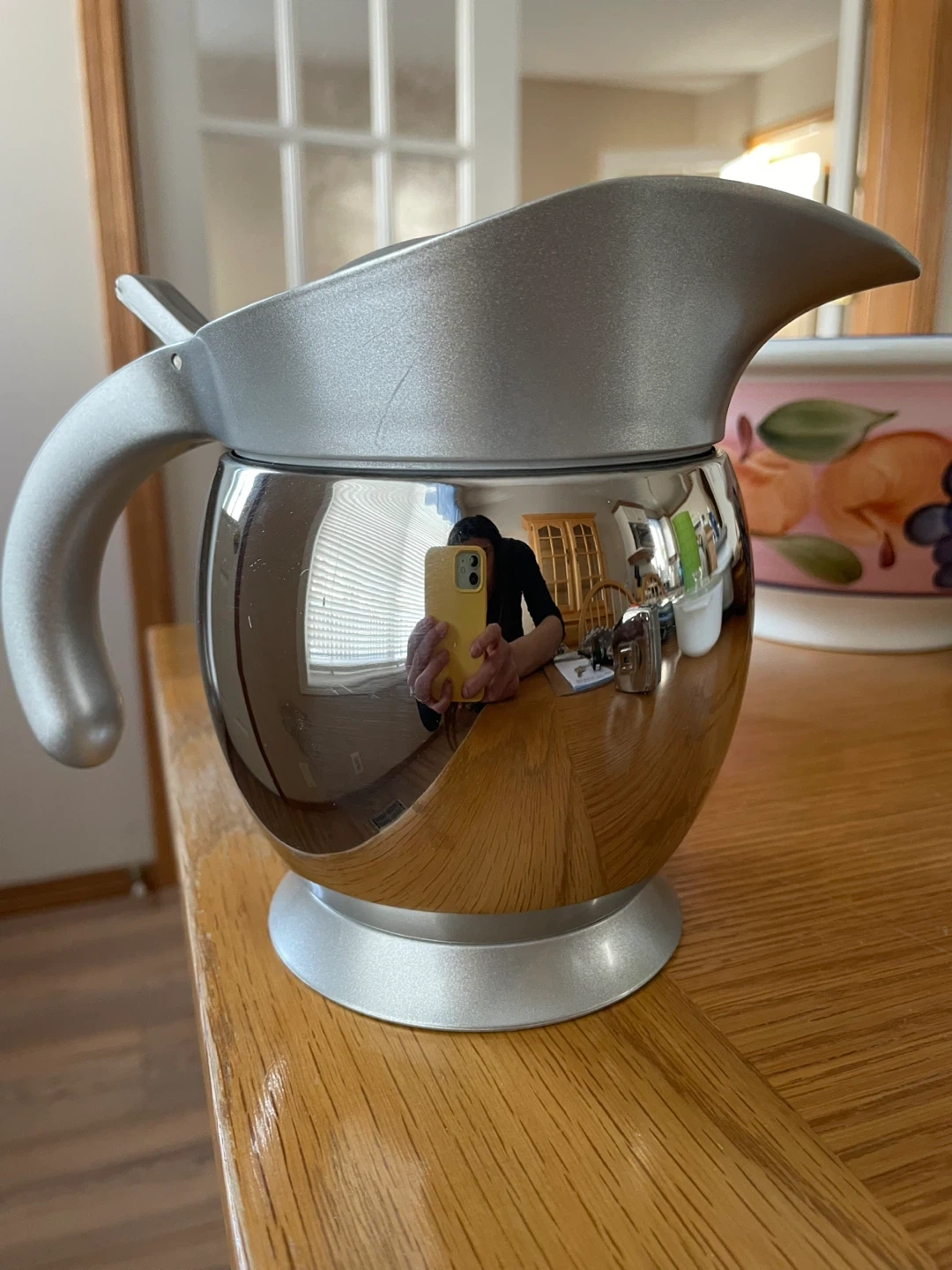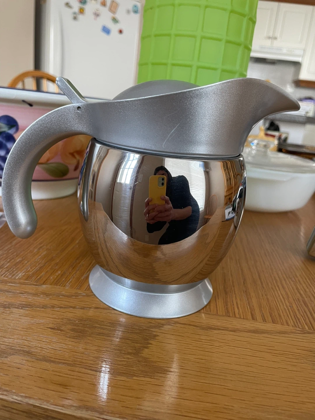 This silver and grey pitcher has a shiny chrome-like finish on the base and a matte silver top and handle. The lid opens and closes. It measures approximately 7 inches tall.
