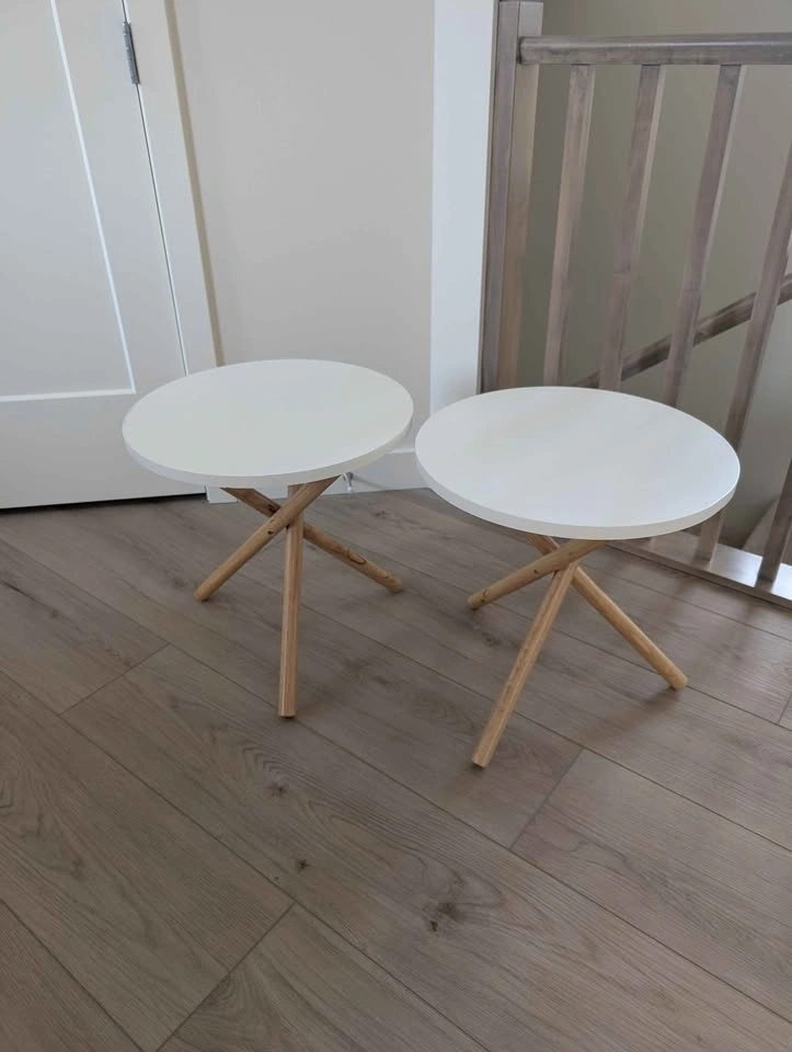 Small round side tables / night stands. Fair condition, shows signs of use with small paint chips on the edges. Each measures 17" round and 17" high. Selling both for $40, not available separately. Pickup only. If the ad is still up, it's available