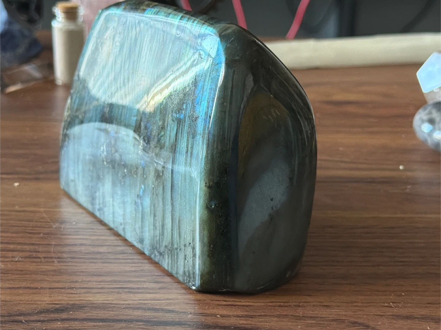 Polished labradorite stone block displaying iridescent blue and green flashes. Its unique parallel striations and beautiful sheen make it a striking decorative piece. This natural mineral specimen offers a captivating display of light and colour.