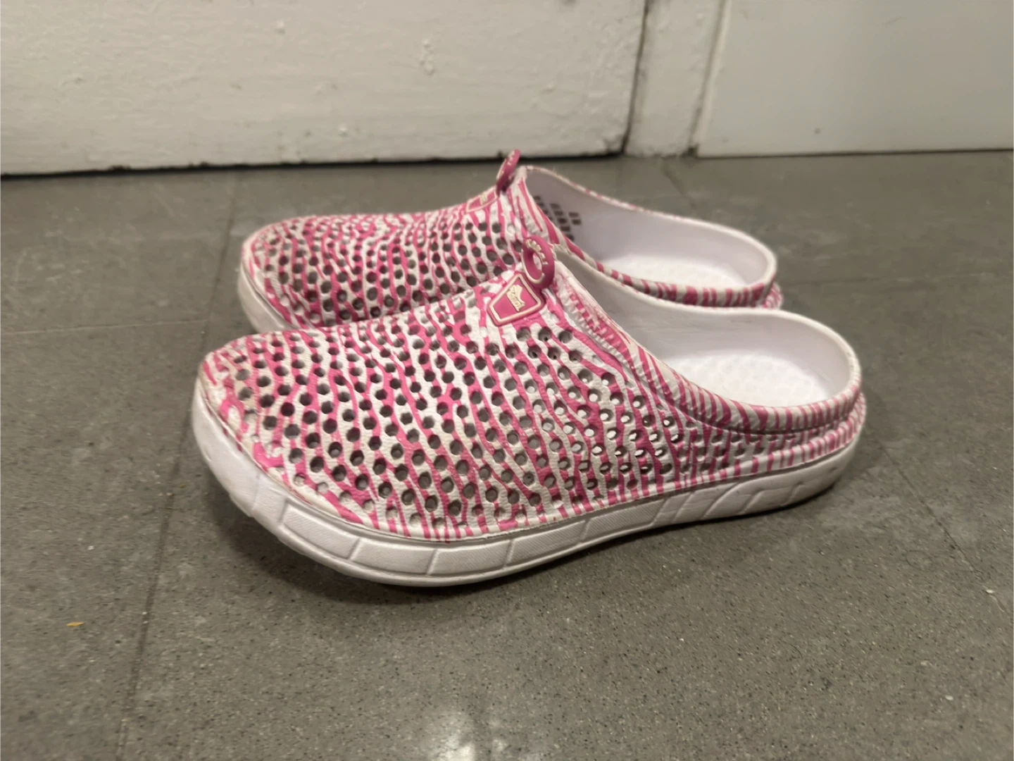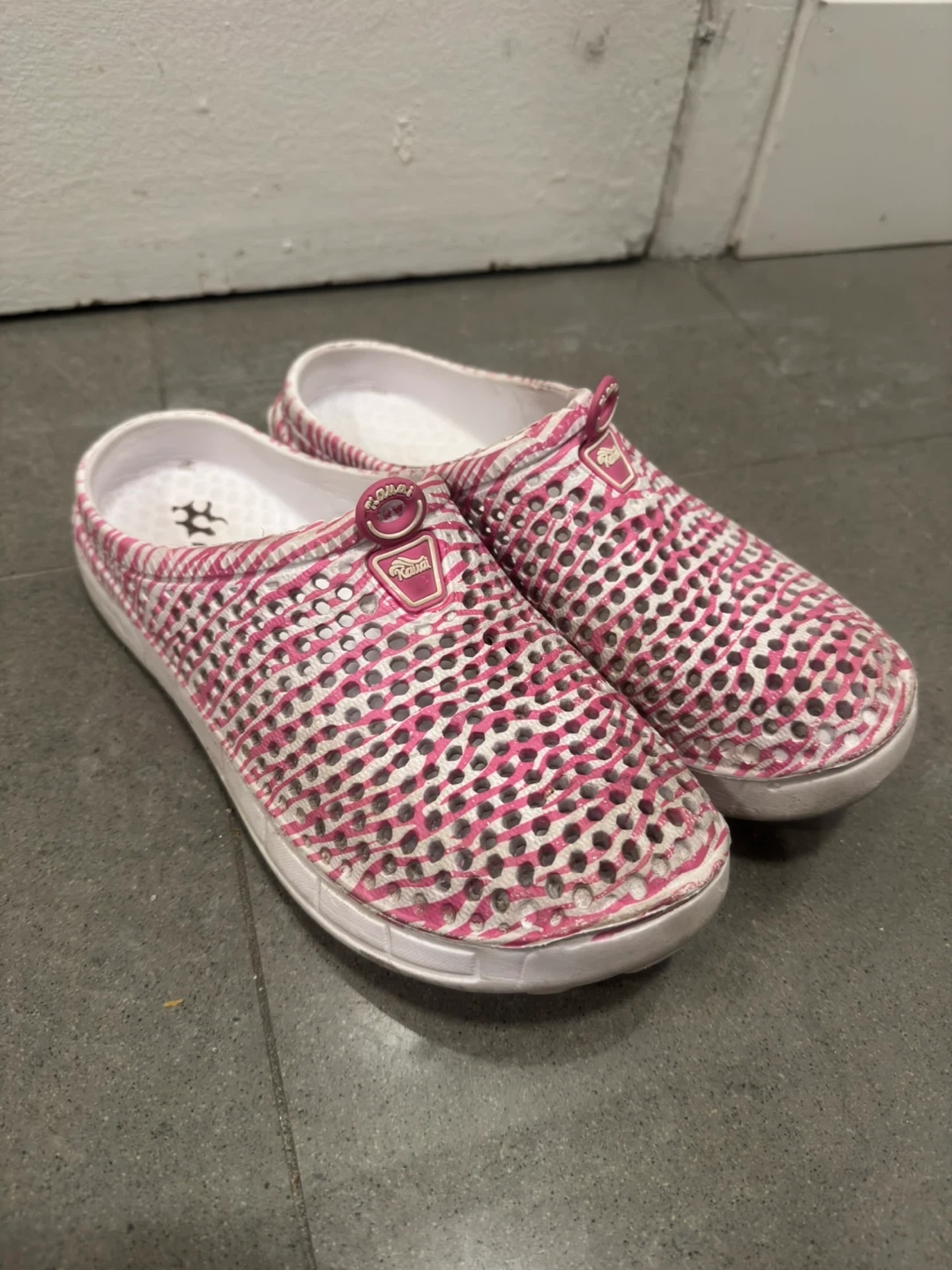 Selling a pair of Kauai pink and white slip-on clogs. Used quite a bit, but still has life in them. In okay condition and a little dirty.