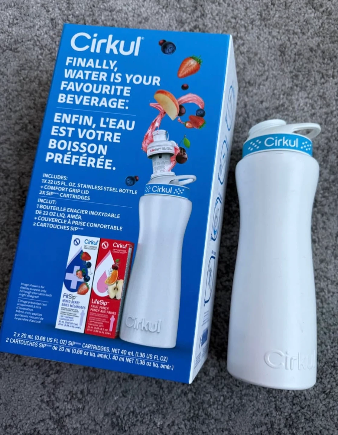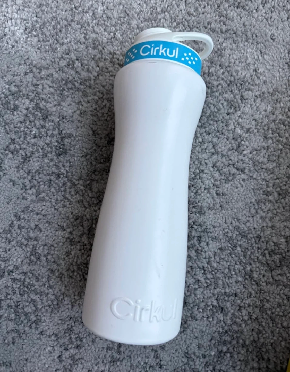 This is a Cirkul stainless steel water bottle. It's 22 oz and includes a comfort sip lid. The bottle is white with a blue lid.