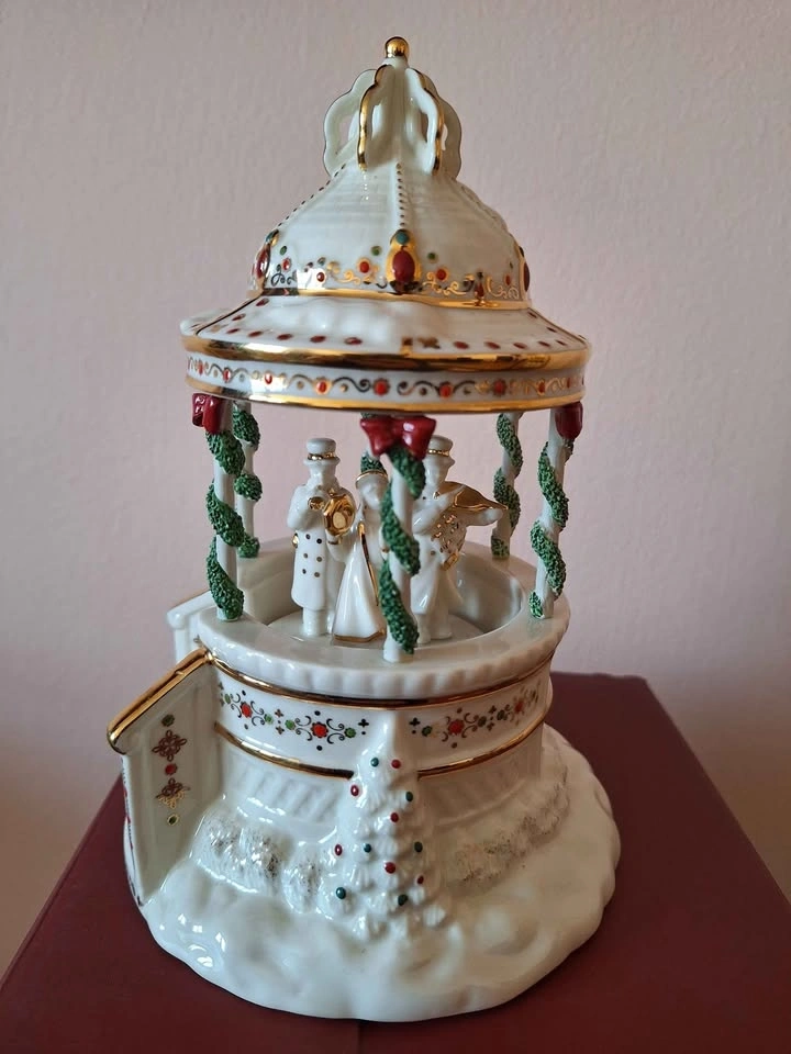 The Lenox Mistletoe Park Series ~MUSICAL GAZEBO BANDSTAND~ Village Treasures is a beautifully crafted porcelain figurine featuring a musical gazebo bandstand scene from the Mistletoe Park collection. The festive winter-themed piece is perfect for collectors and those looking to add a touch of Christmas cheer to their village display. Packaged in a box, this figurine is a charming addition to any holiday decor, bringing the magic of music and Christmas traditions to life in a quaint and intricate design. New in original packaging, though the foam cover for the top is missing. It will be packed well.