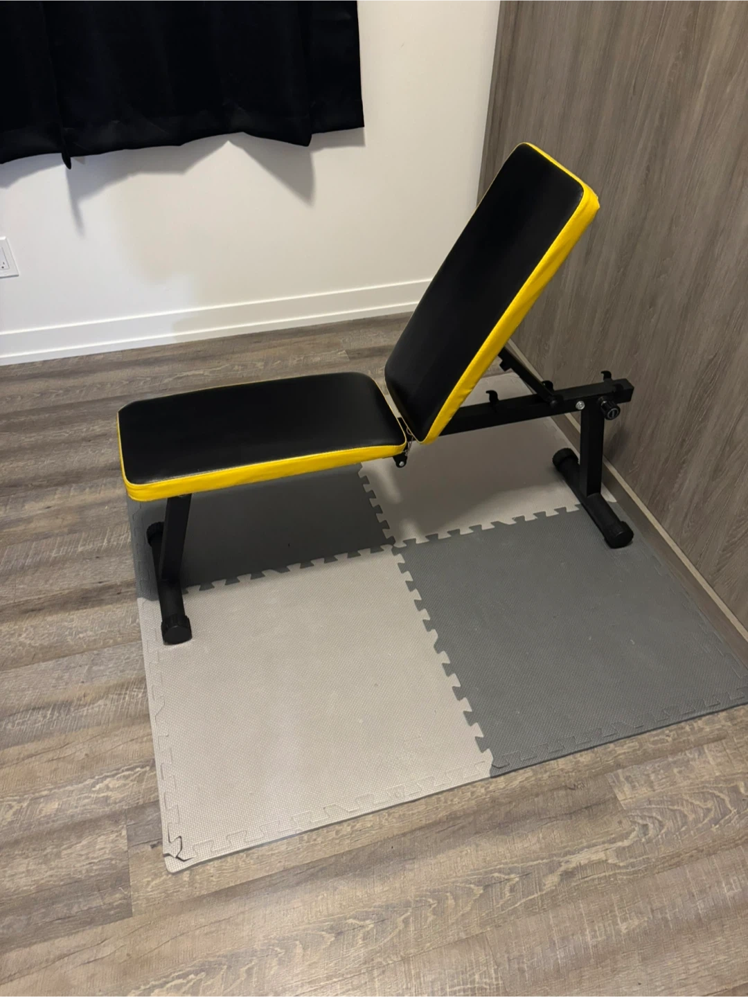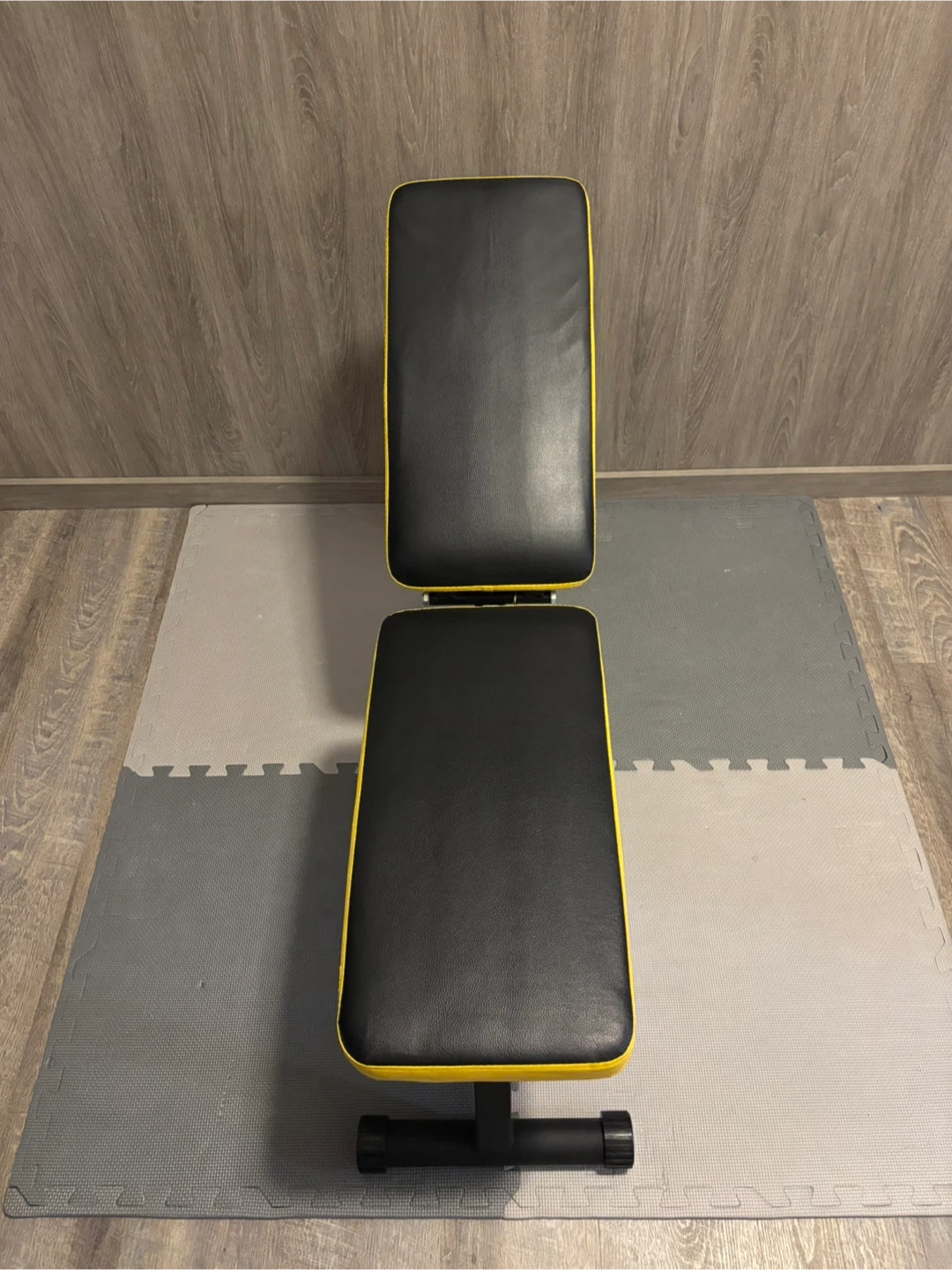 This is a black and yellow adjustable workout bench. It's designed for strength training exercises. This bench can be folded for convenient storage when not in use.