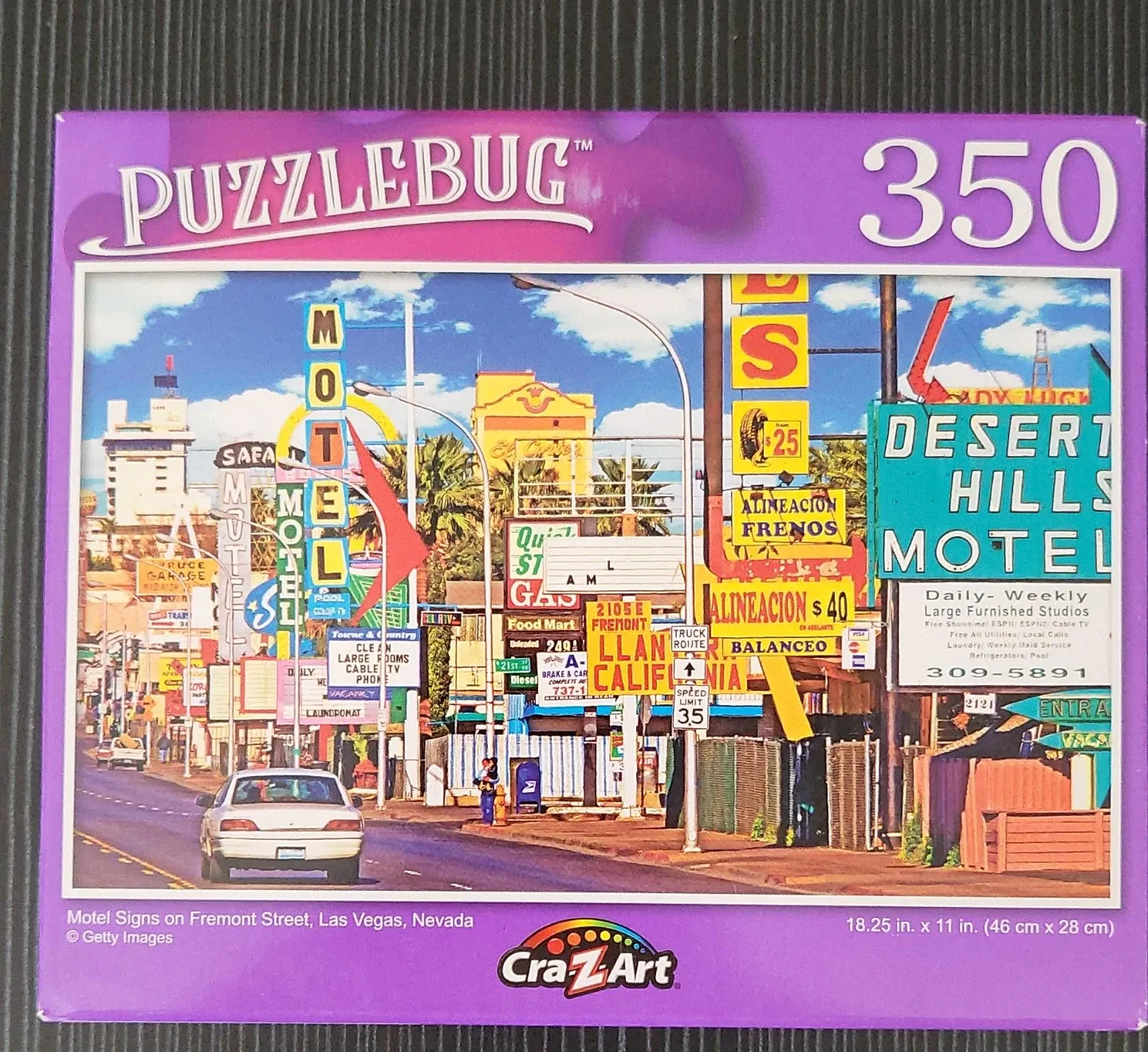 This is a 350-piece puzzle from Puzzlebug featuring iconic motel signs on Fremont Street in Las Vegas, Nevada. The finished puzzle measures 18.25 x 11 inches (46 cm x 28 cm).