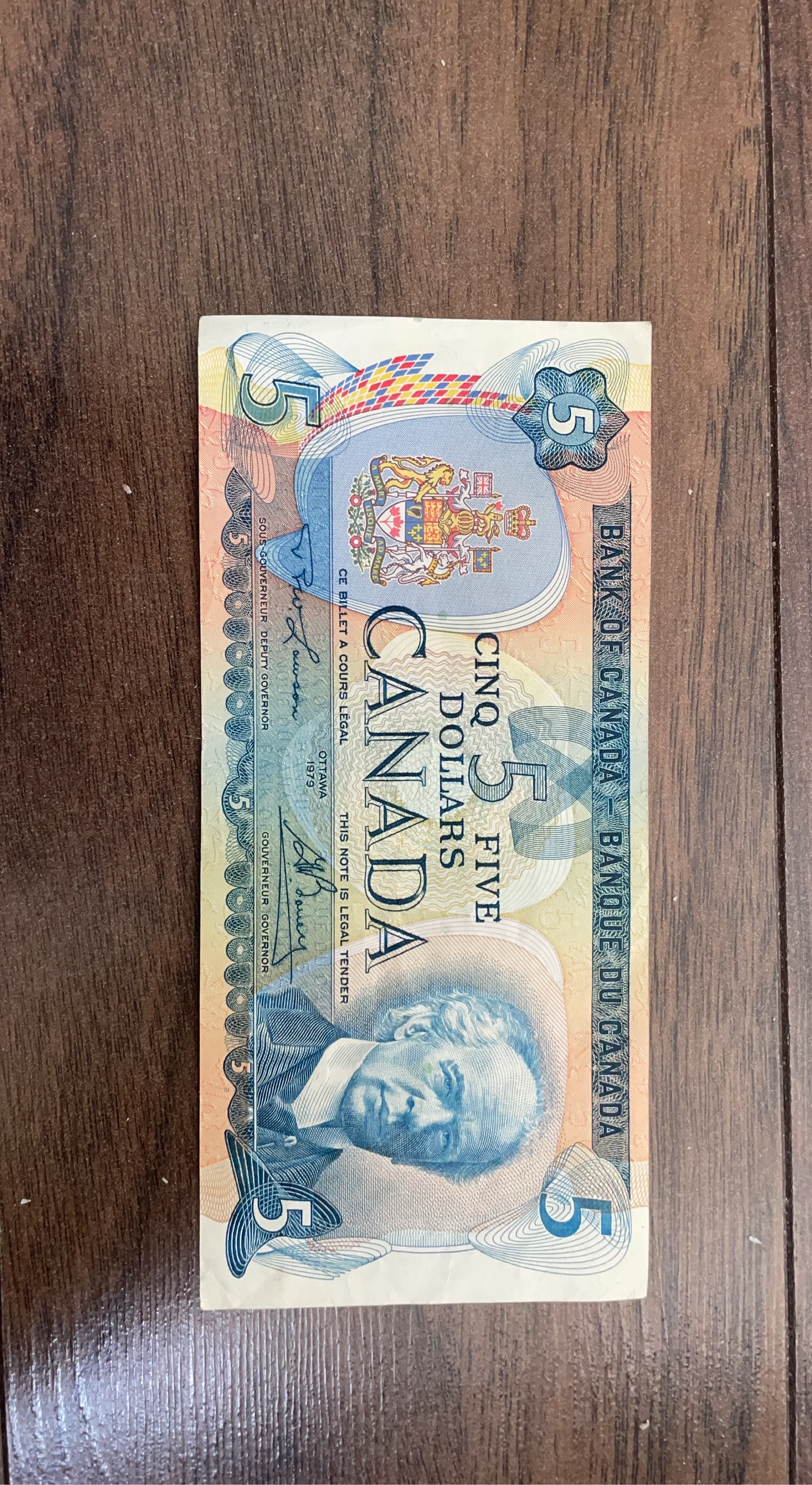 Bank of Canada five dollar banknote from 1973. Features a portrait of Sir Wilfrid Laurier on the front. The reverse depicts a fishing scene. This note has serial number 30020111495.