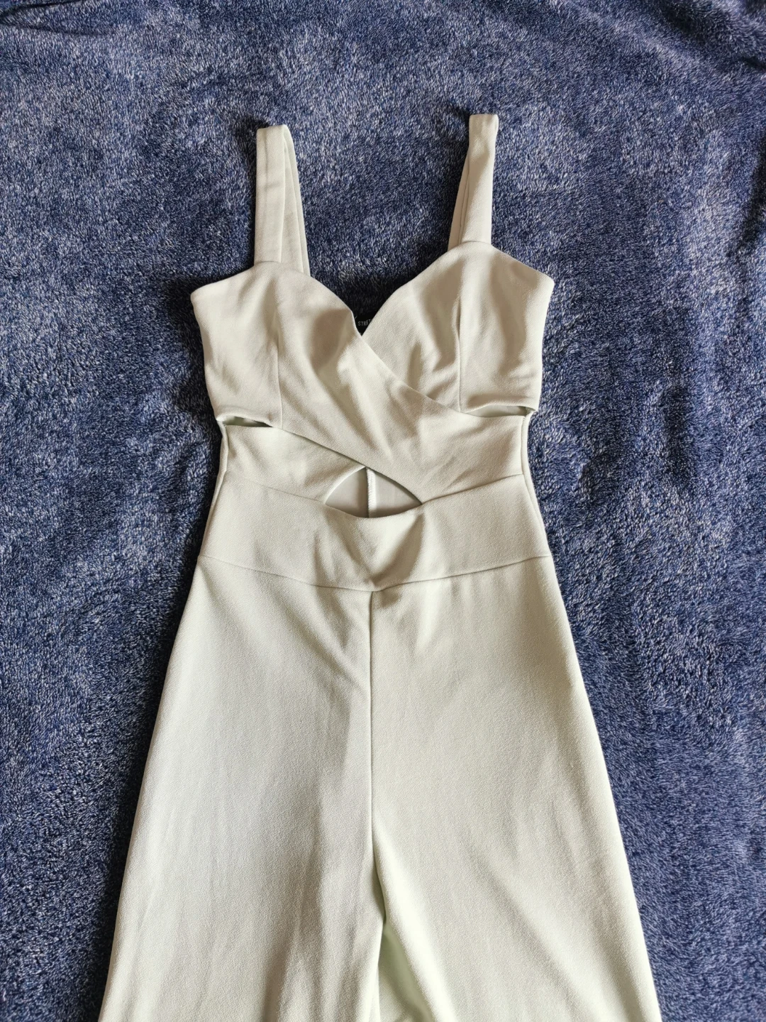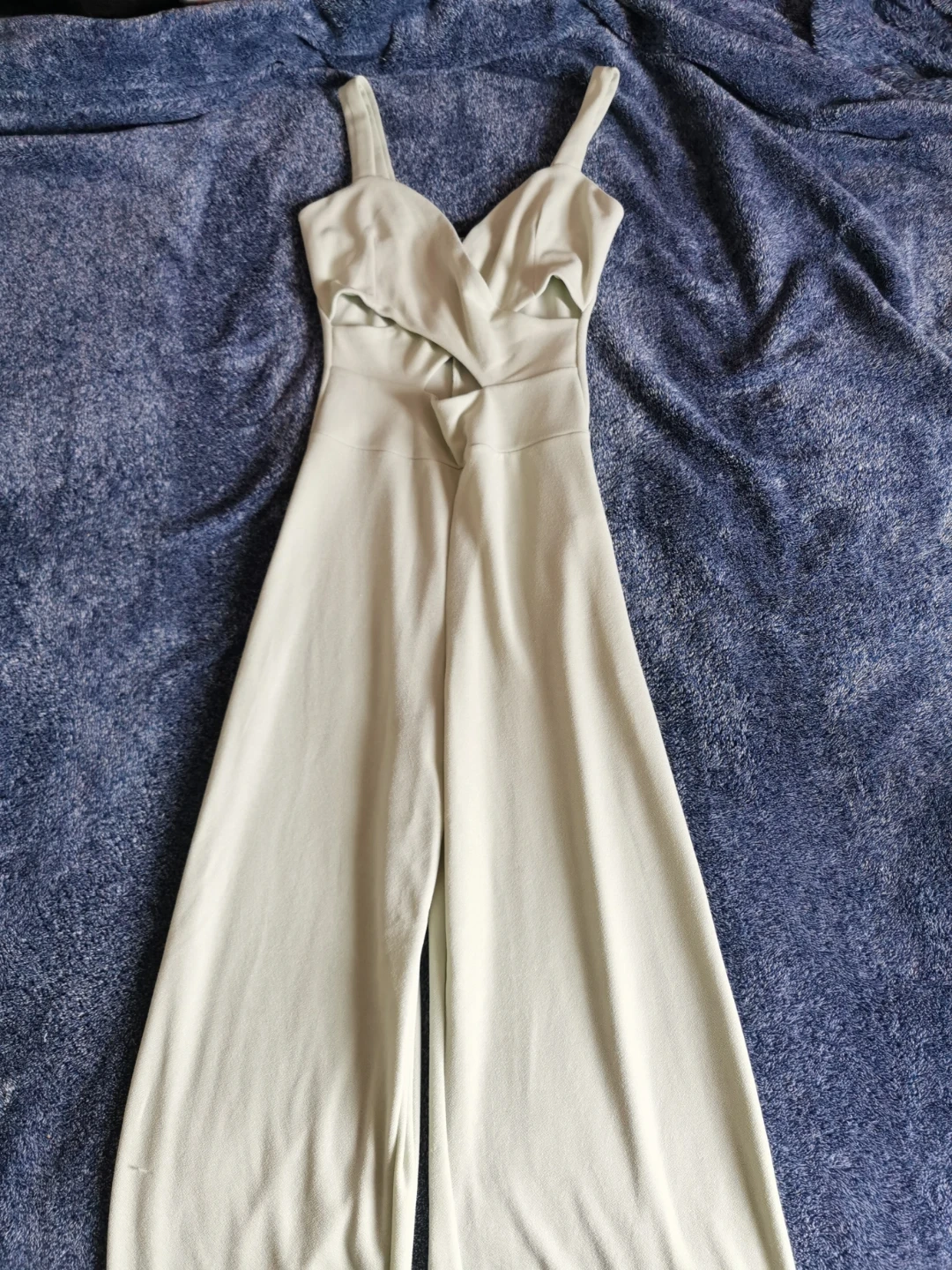 This light mint green jumpsuit is from Streetwear Society. It features a flattering V-neckline with cut-out details. Size is small.