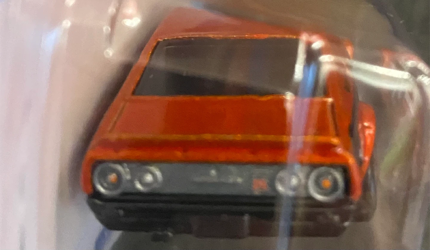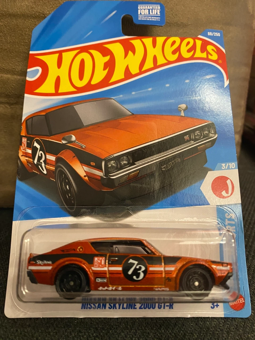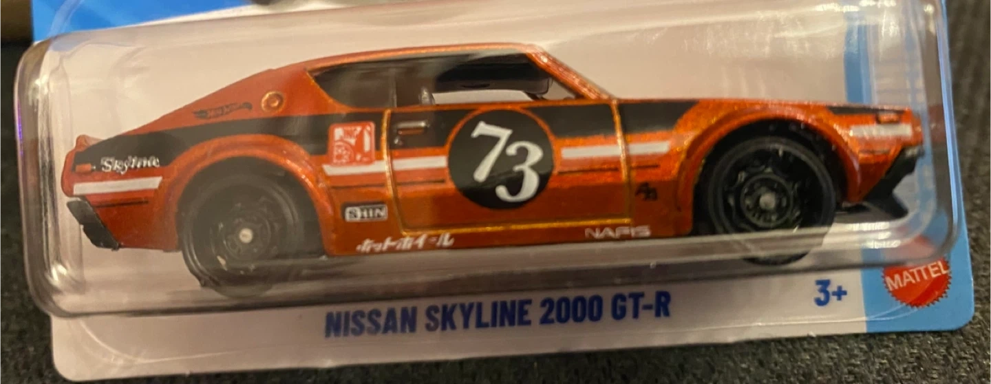 New! Hot Wheels die-cast model of the Nissan Skyline 2000 GT-R. It's the orange variant with black racing stripes and the number 73