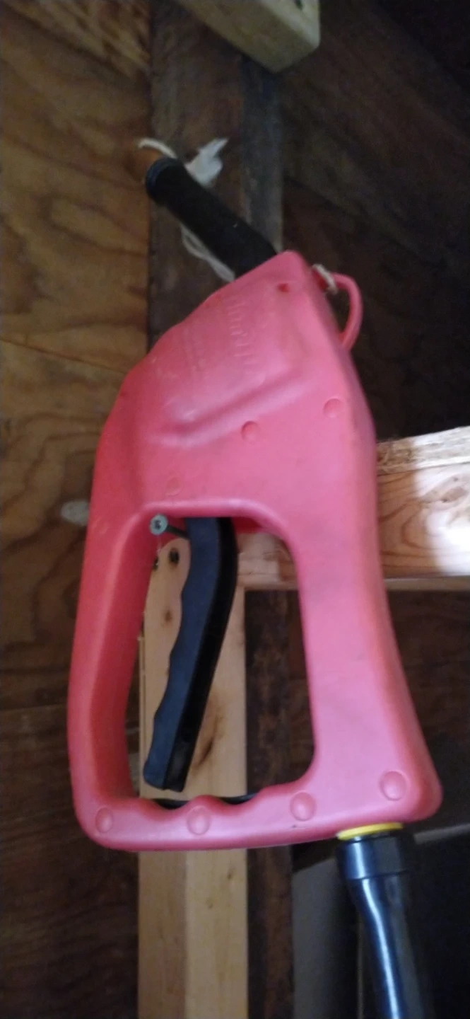 I'm selling my dad's red gasoline can it's a 6 g or 22.6 L it has a gasoline handle on it so you can control how much gas you put into whatever you're using my dad had it for his riding lawn mower he kept it in the shed I only seen him use it for once or twice it's like brand new the red is faded a little bit but he kept it locked in the shed where the lawn mower was maybe that's why