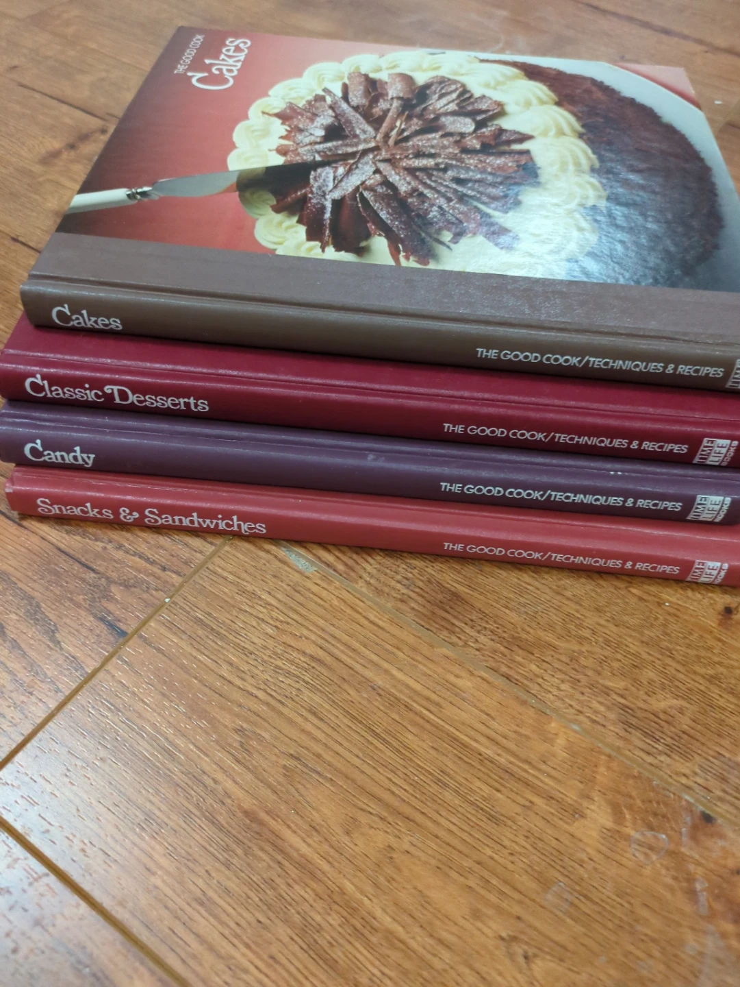Set of four 'The Good Cook' recipe books covering Classic Desserts, Cakes, Snacks & Sandwiches, and Candy. Perfect for home bakers and recipe enthusiasts looking to expand their culinary repertoire.