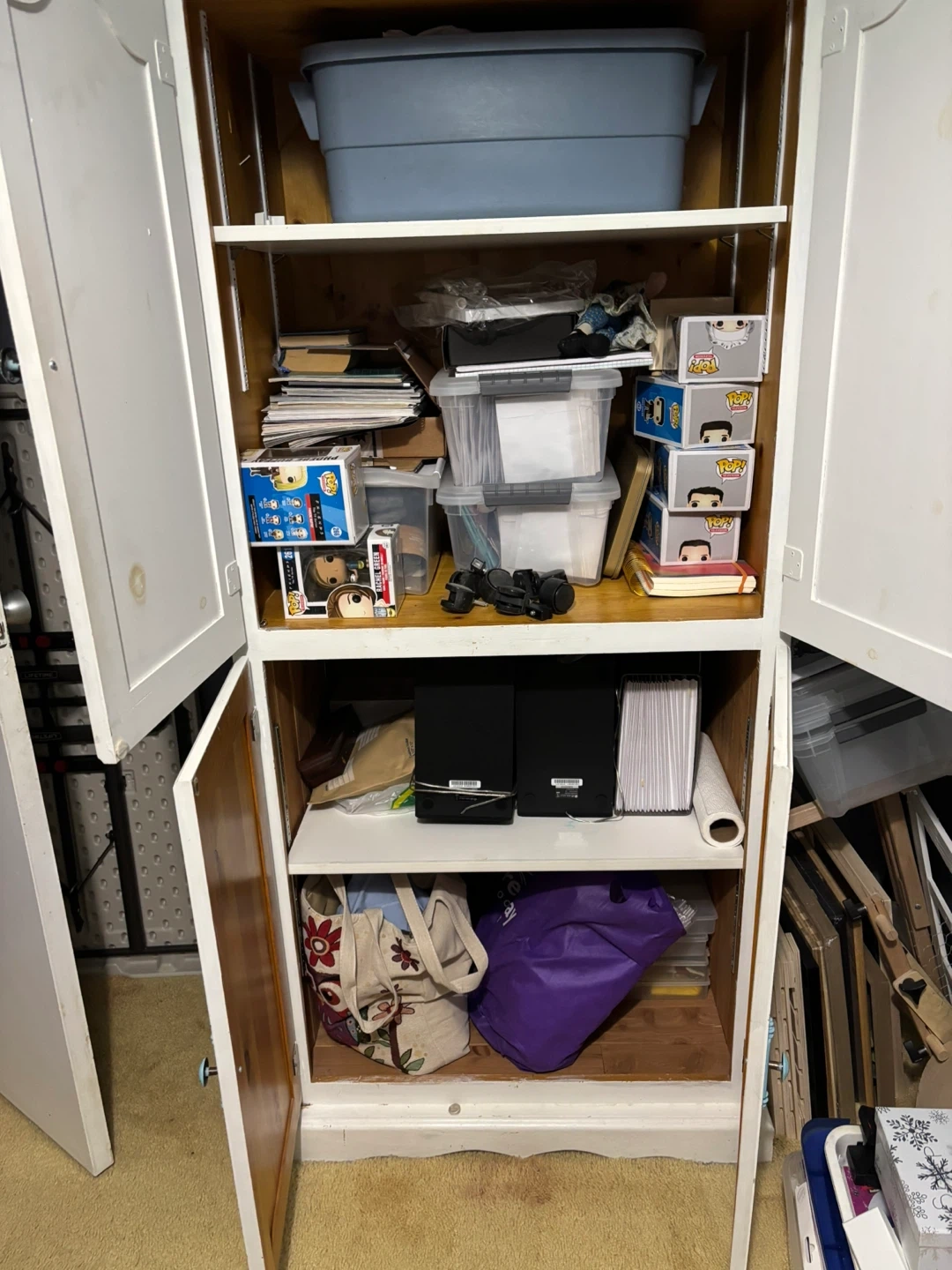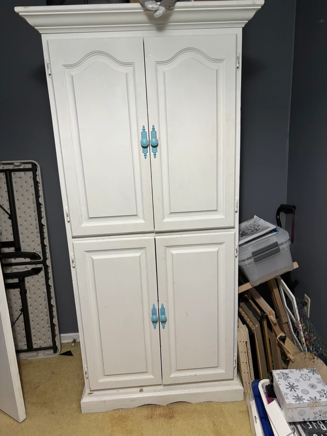 This two-door cabinet offers ample storage space. It features two upper doors and two lower doors, all with charming blue decorative handles. The interior is divided into shelves for organized storage. It's great for stowing away household items!