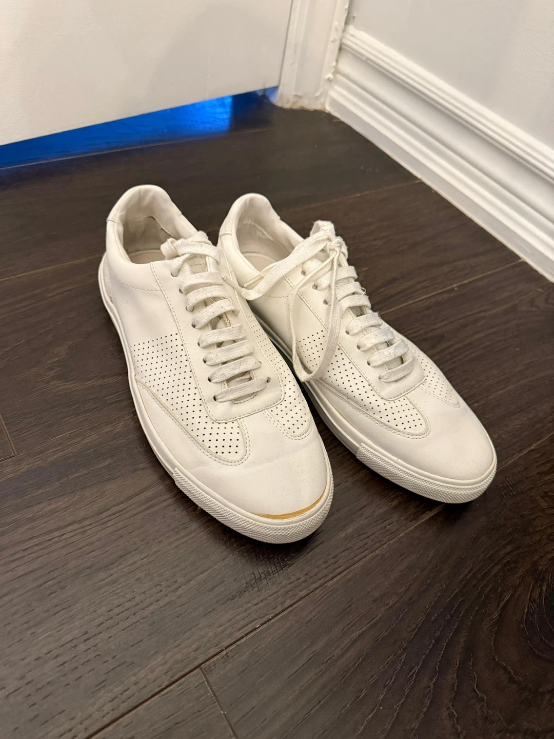 These are white leather sneakers from ZARA. They're designed with perforated details on the toe box and sides. The size is 41. Pick up at either Bathurst and center, or Richmond Hill! Delivery with additional cost.
