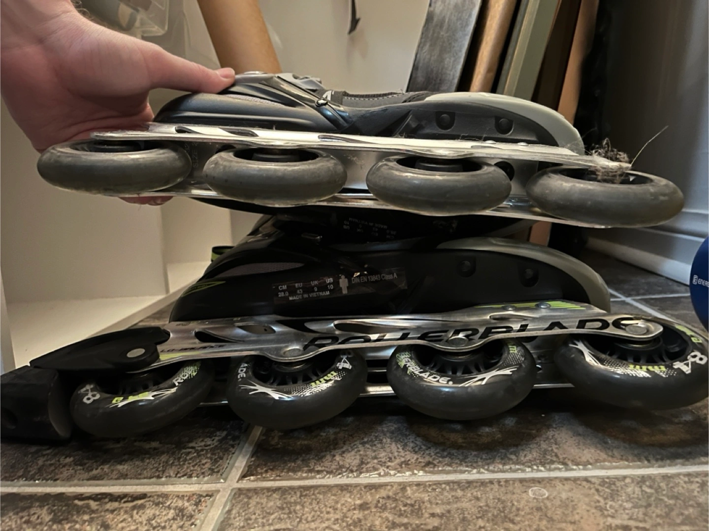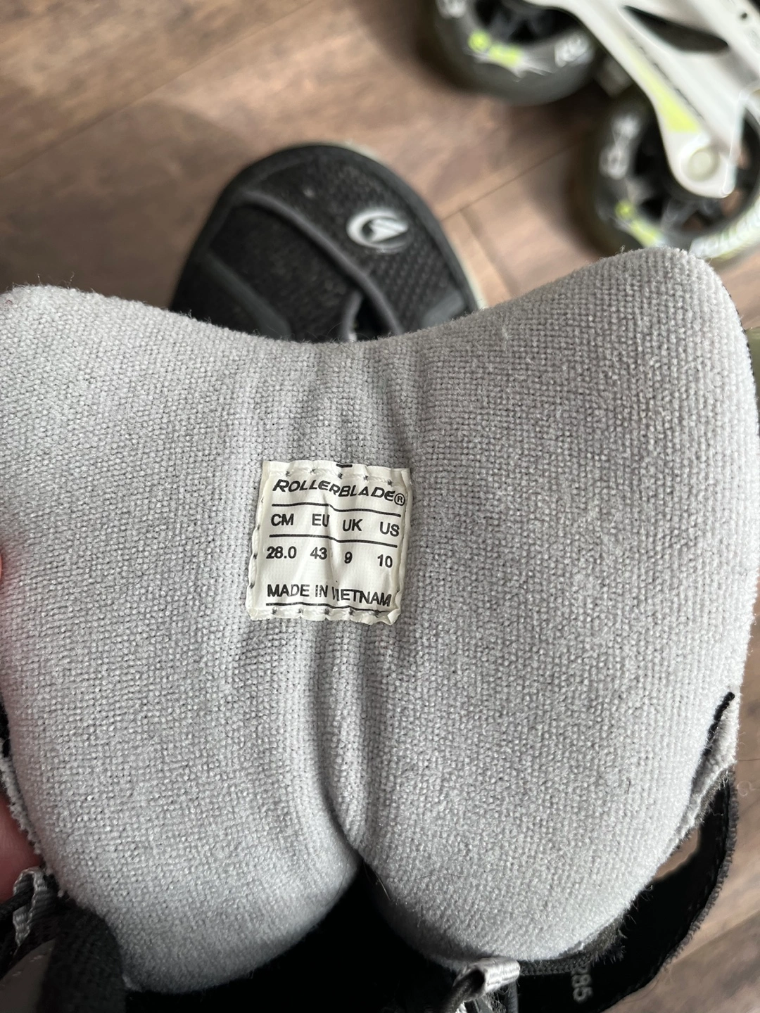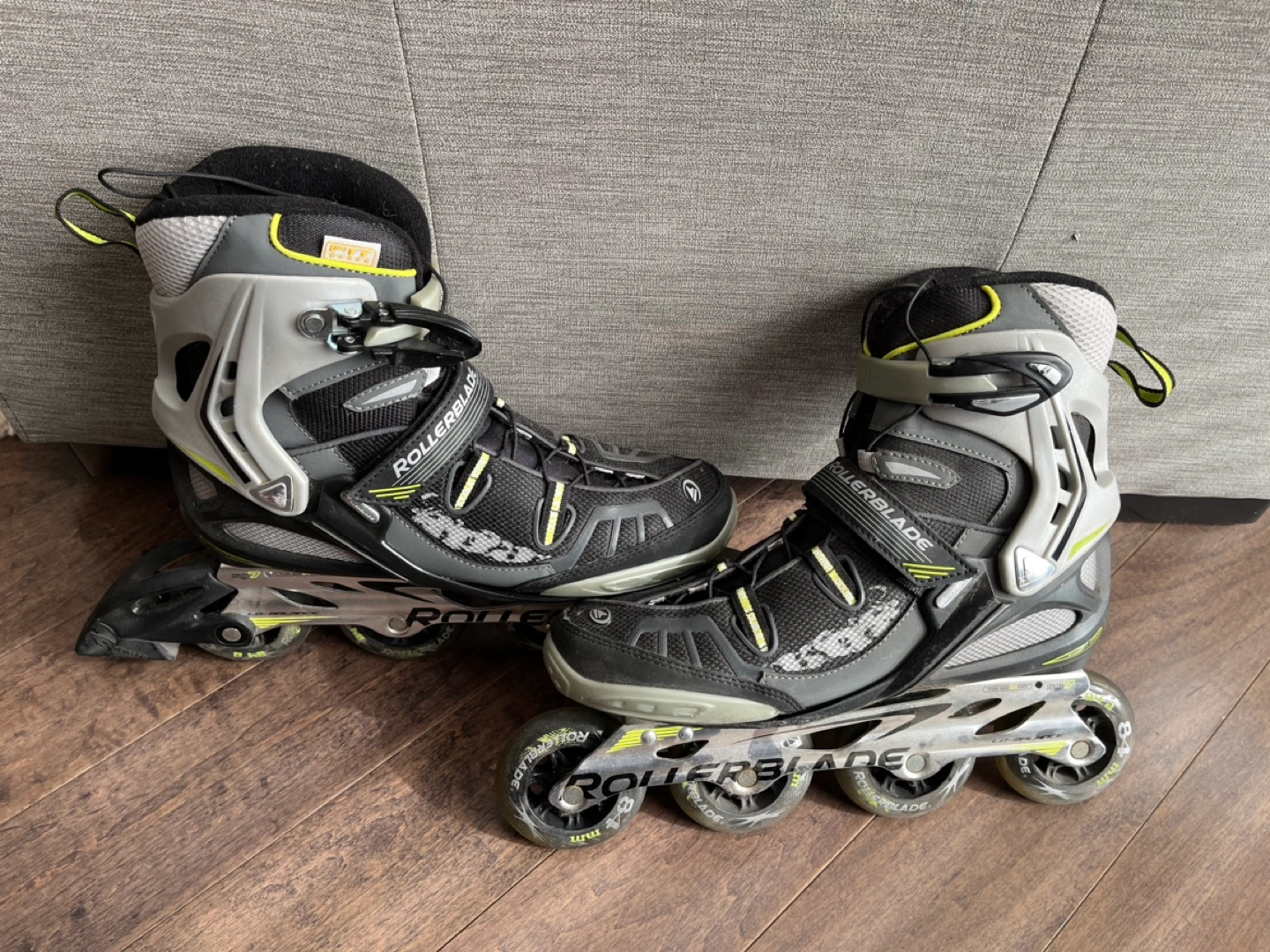 Used Rollerblade inline skates. Size US Men's 10. Grey, black, and lime green colour scheme. Good condition.