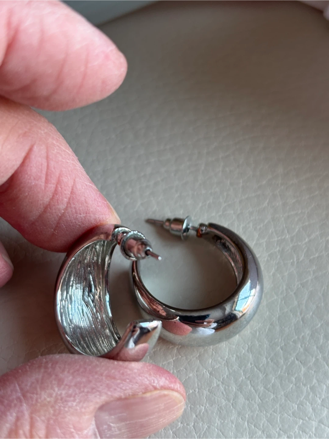 These are a pair of never worn silver (not real) chunky hoop earrings. I have included a Mejuri box and heart tissue. These earrings are a classic accessory for everyday wear. They are not from Mejuri. Only the box is from the brand Mejuri.