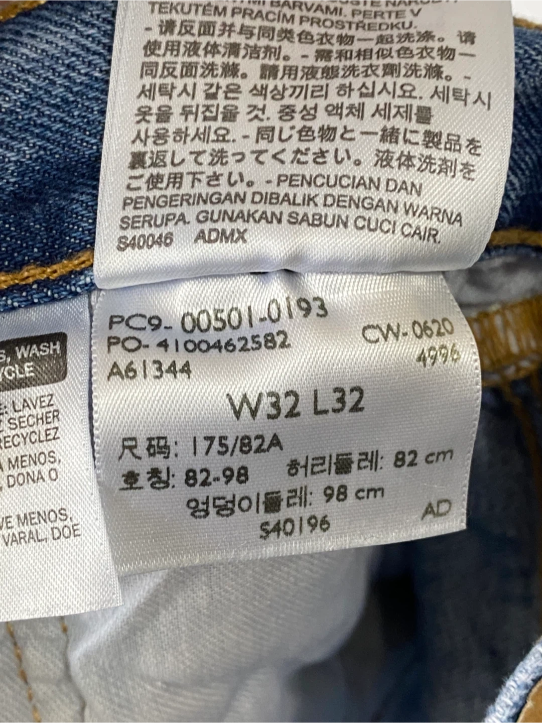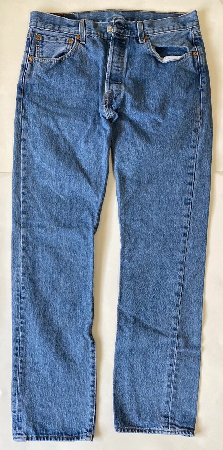 Classic blue denim Levi's 501 jeans. Made of 100% cotton. Waist size 32, inseam 32. Button fly closure.