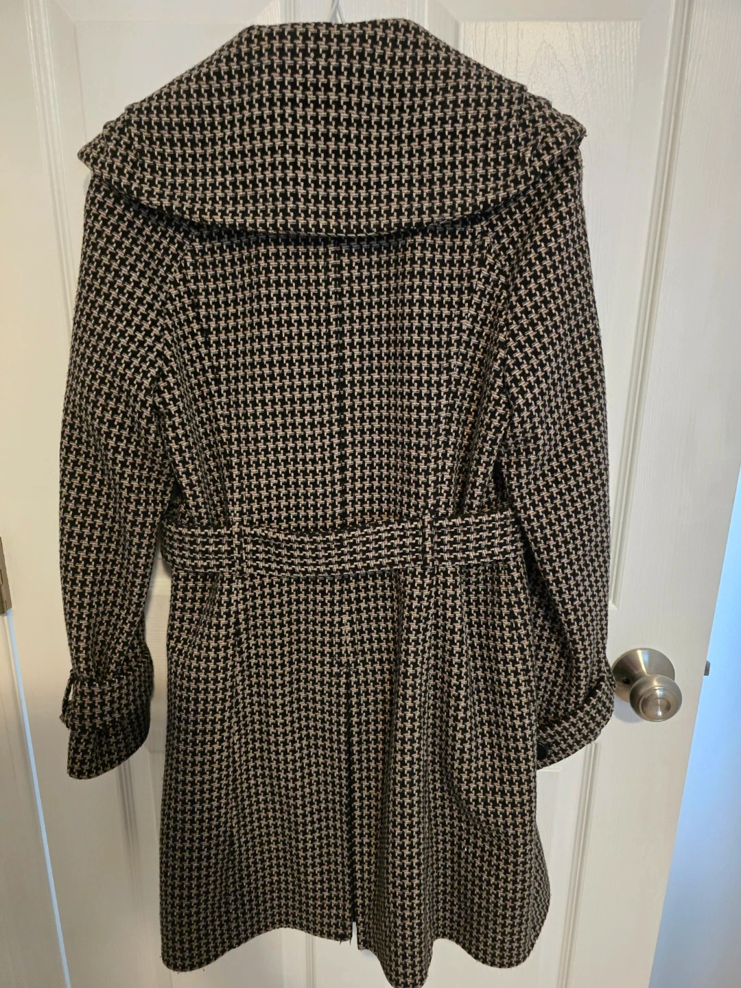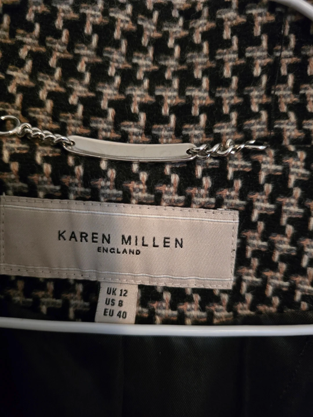 Karen Millen coat with a classic houndstooth-style pattern. It features a tie waist for a defined silhouette and a stylish collar. Size UK 12, US 8, EU 40.