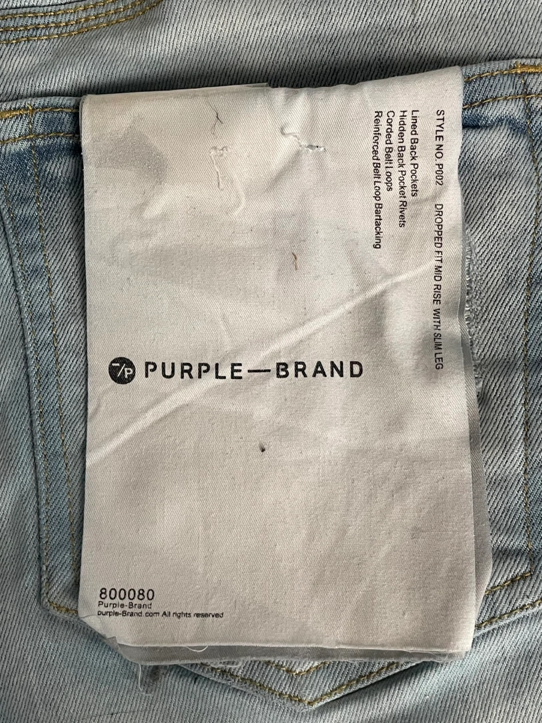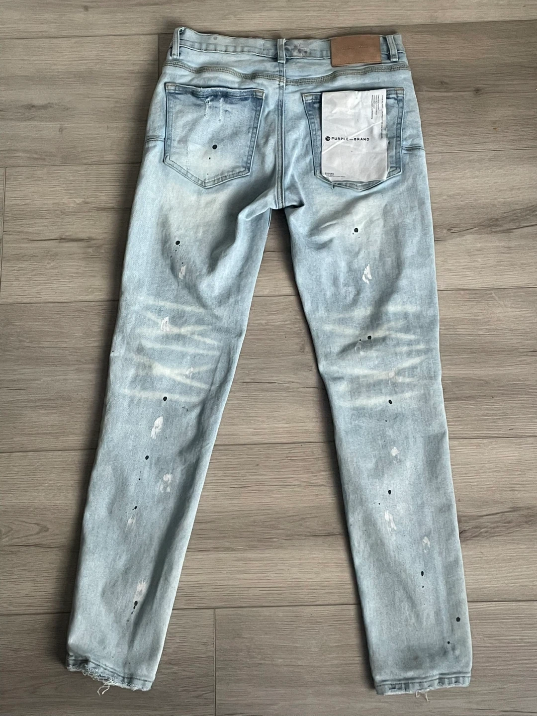 Light wash denim jeans from Purple Brand. They feature a distressed look with rips and paint splatter detailing. These jeans have a dropped fit with slim legs. All coating, abrasions, and repairing are hand finished by experienced technicians.