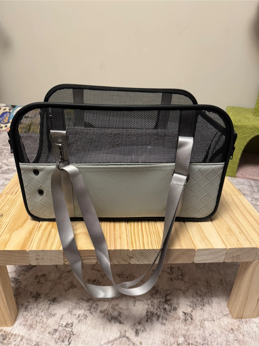 This pet car seat is made with durable mesh panels for ventilation and a grey exterior. It includes a soft, plush lining. Suitable for small pets during travel. Has a place for a leash