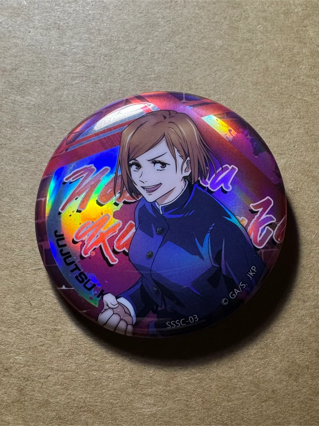 Holographic pin featuring Nobara Kugisaki from Jujutsu Kaisen. It's a round pin with a safety clasp on the back. SSSC-03 model number visible.