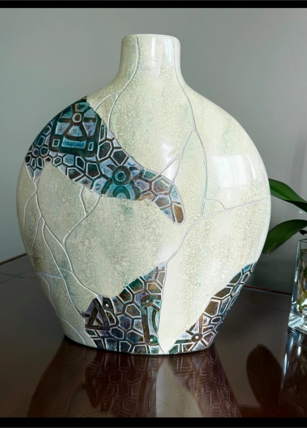 This is a well cared for vintage ceramic raku-fired vase (from original owner) featuring a white crackle glaze with turquoise blue and black mosaic pattern. It’s a lovely unique piece.