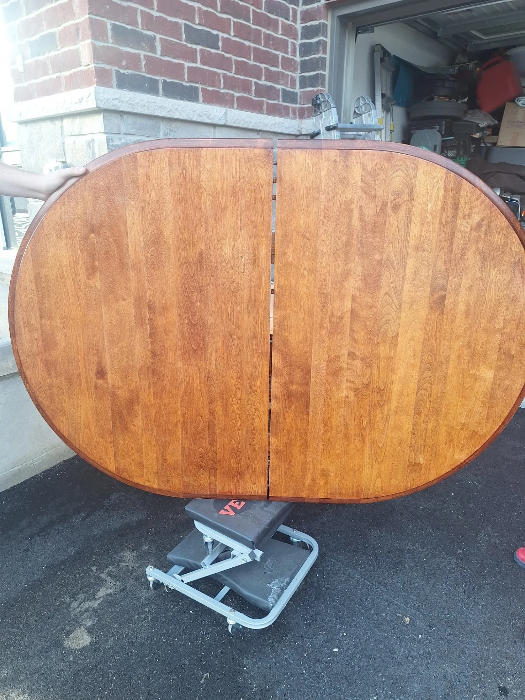 This is a solid wood dining table with a rich wood finish. It's oval-shaped and appears to have extendable leaves, though they are not currently attached. The table has a sturdy pedestal base and shows some signs of wear, but is otherwise in good condition. It's ready for a new home!