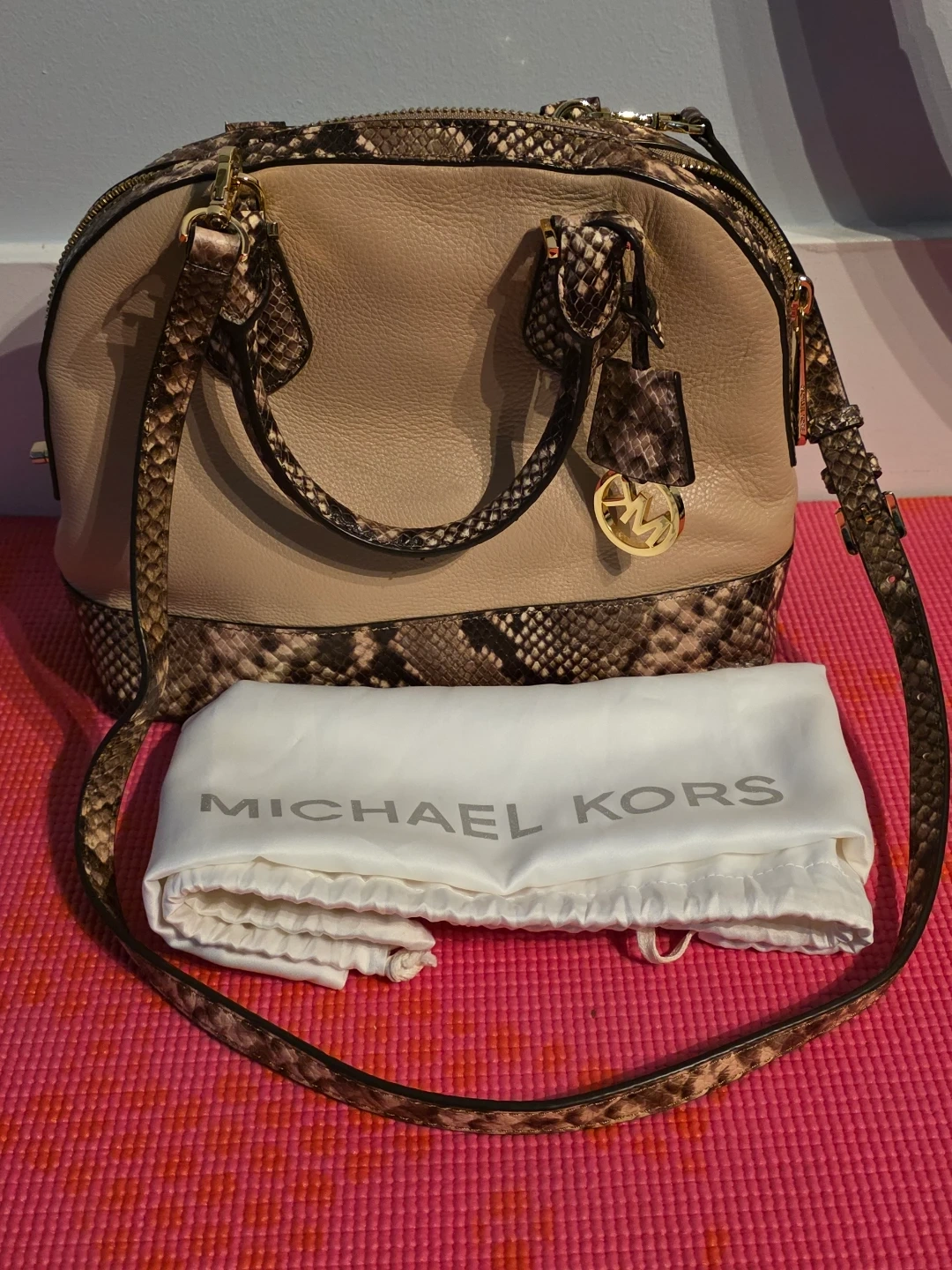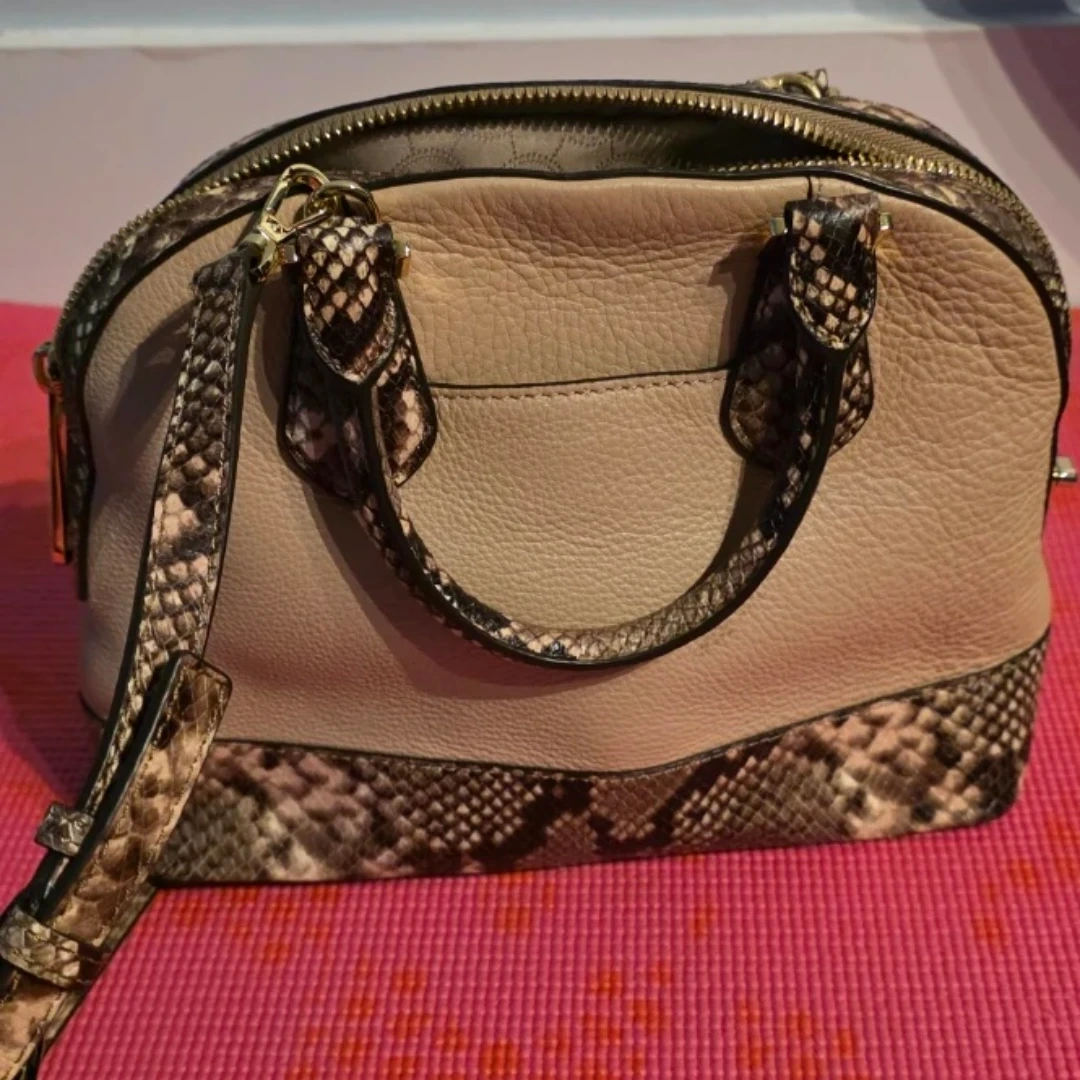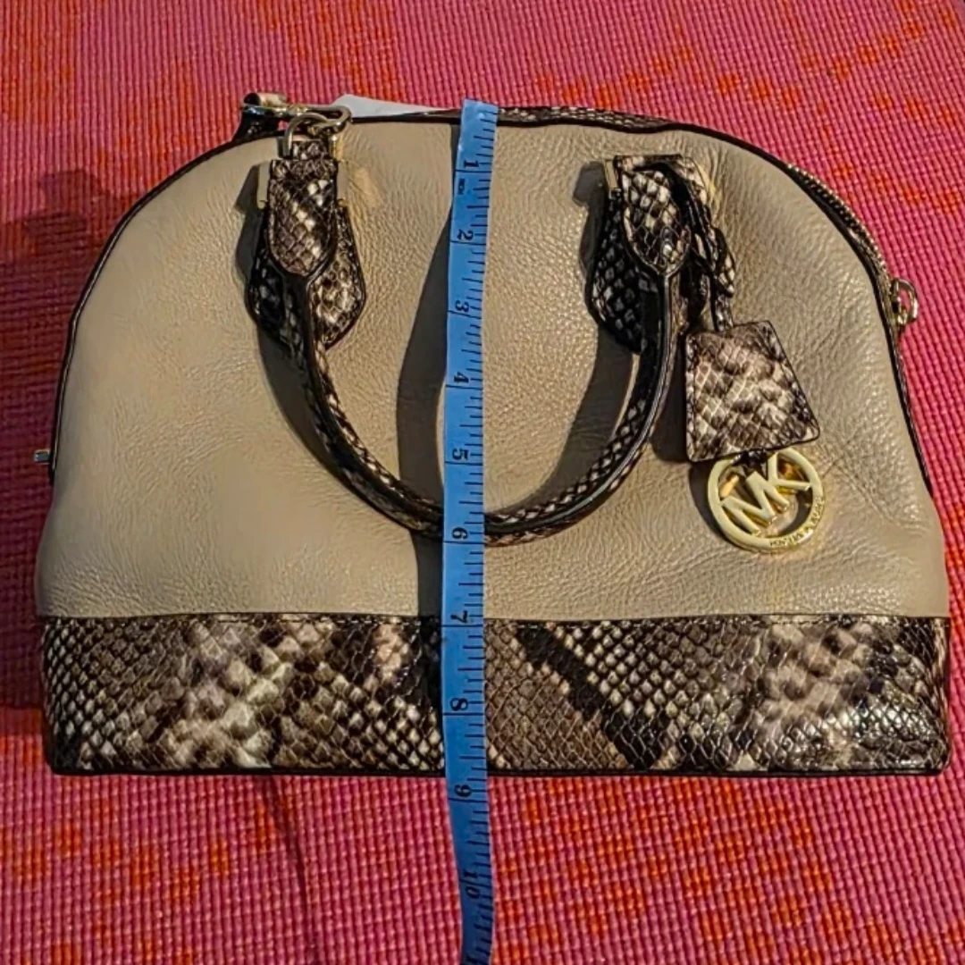 Brand new, Michael Kors dome satchel handbag. It's a beige leather with snakeskin accents. Includes dust bag. This bag is suitable for everyday use or special occasions.