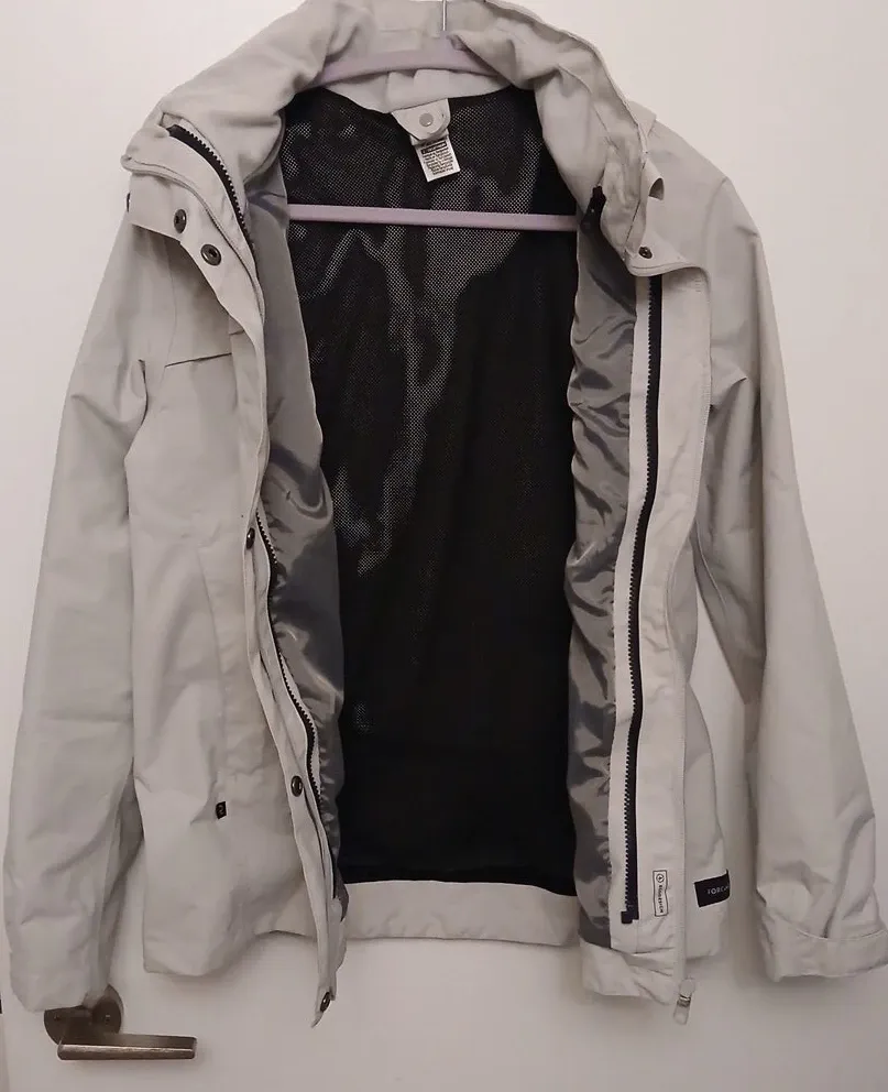 This Forclaz jacket is a light grey colour. It's made for outdoor adventures. It's waterproof!