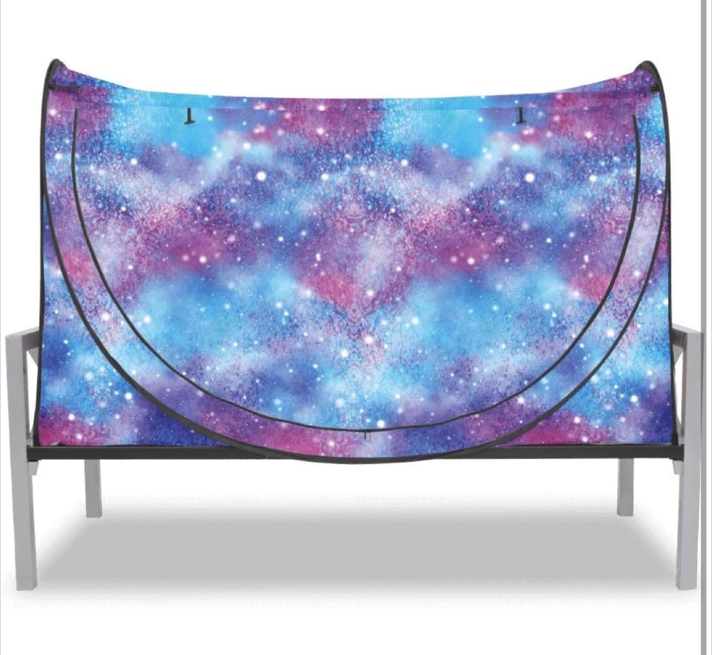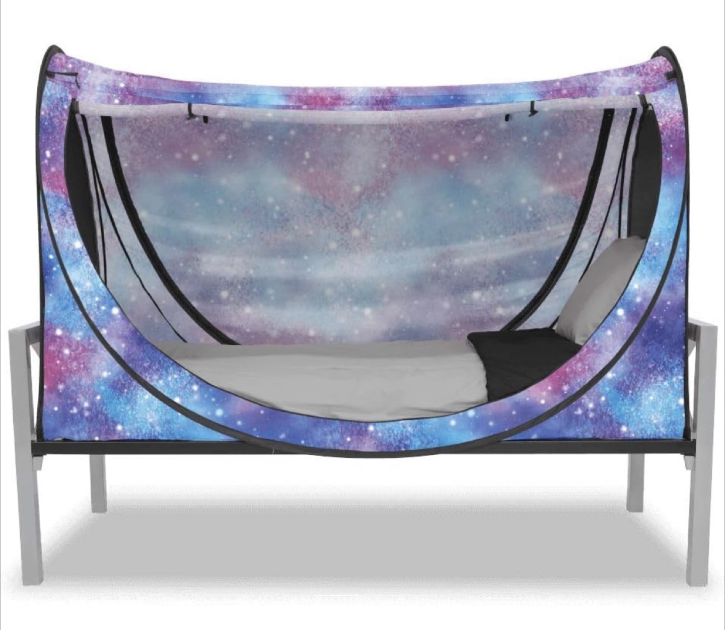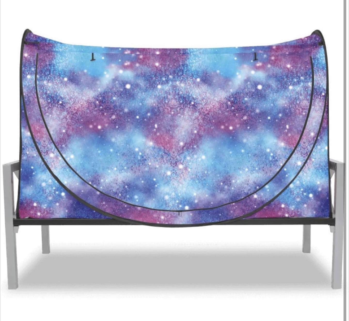 This bed tent features a fun galaxy pattern! It's perfect for creating a cozy and private space for your little one. It fits over a standard twin-size bed.