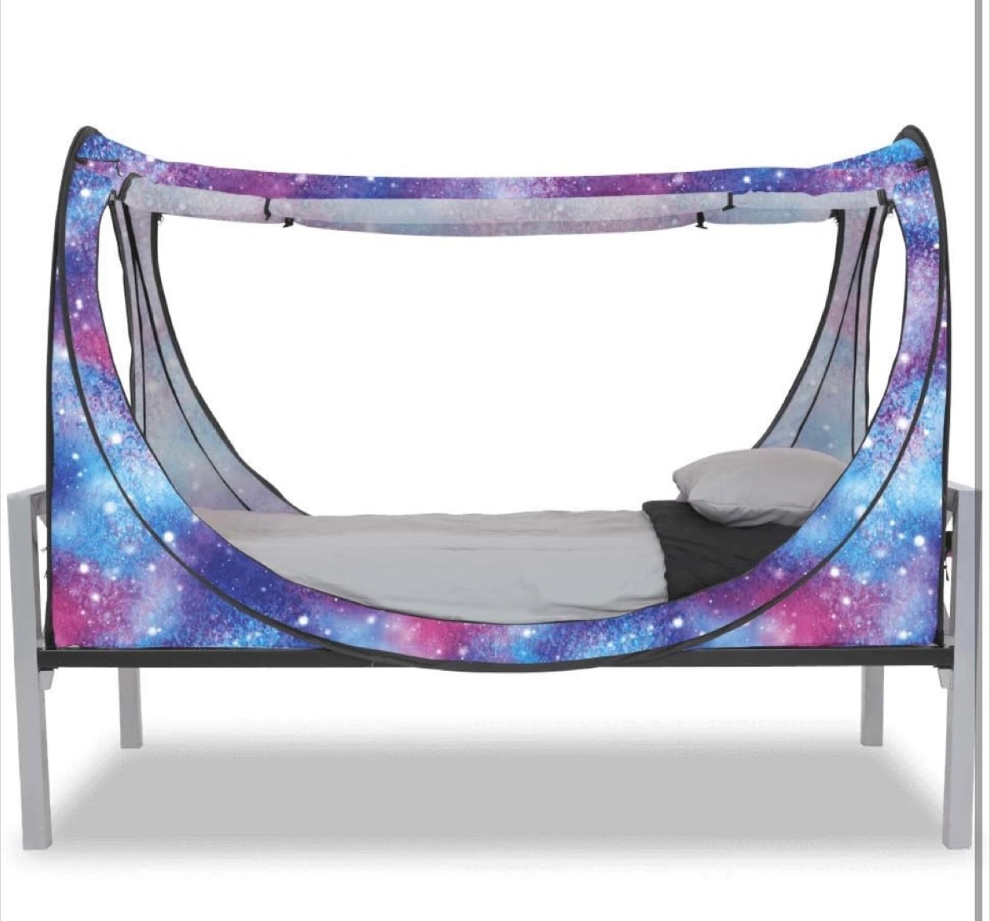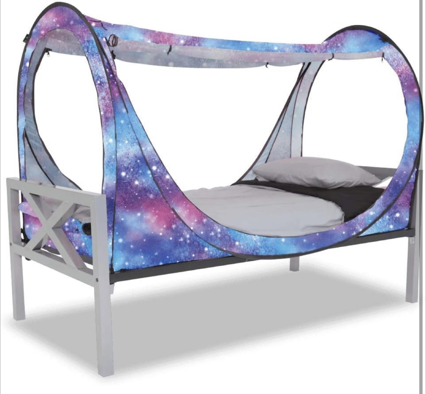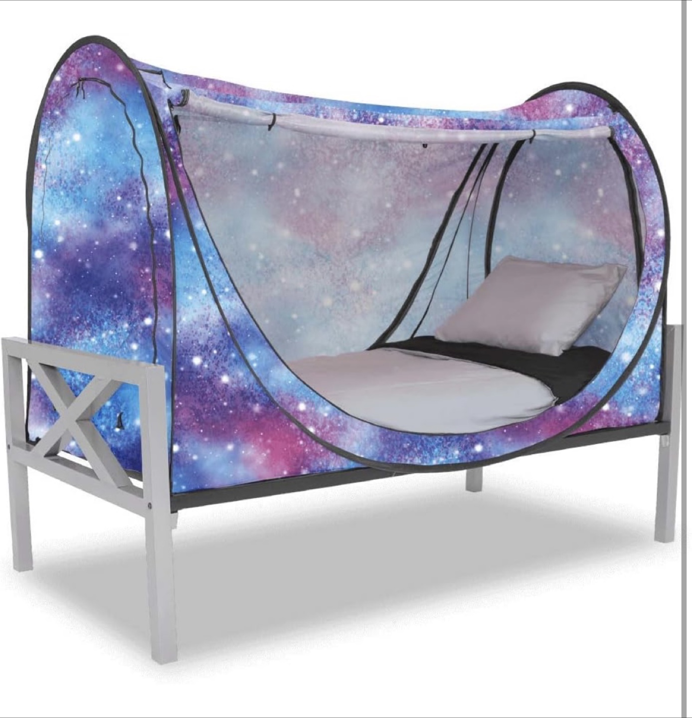 This bed tent features a fun galaxy pattern! It's perfect for creating a cozy and private space for your little one. It fits over a standard twin-size bed.