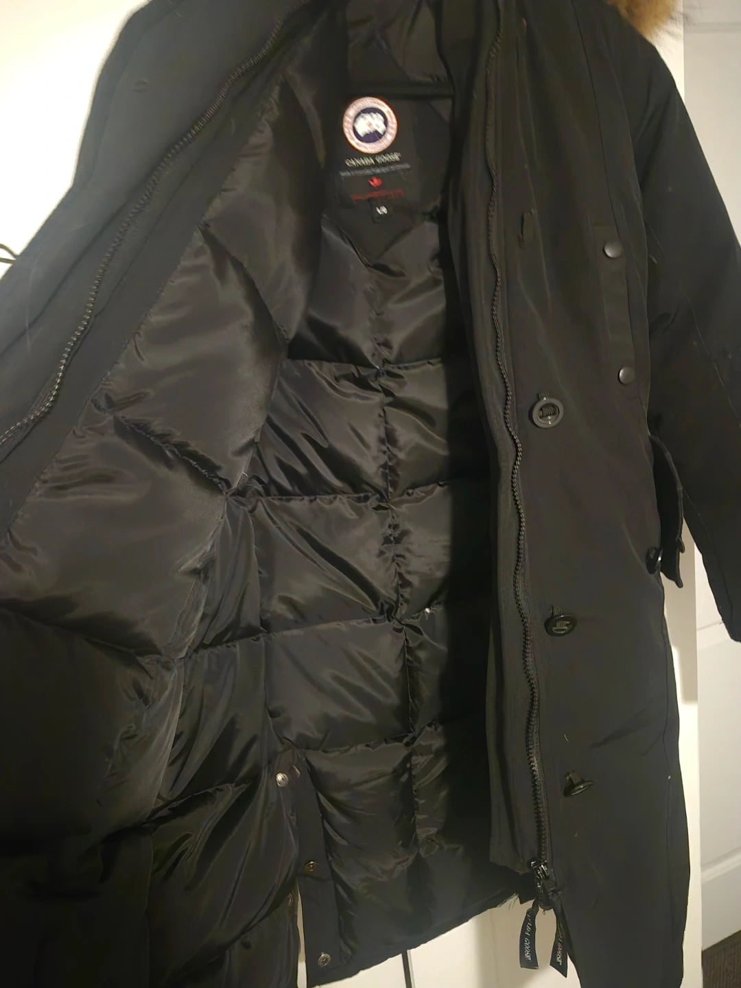 This Canada Goose parka is a warm and durable winter coat. It features a black exterior with a quilted black interior. The iconic Canada Goose Arctic Program logo patch is visible on the sleeve. Its kids lg so its fitting small female