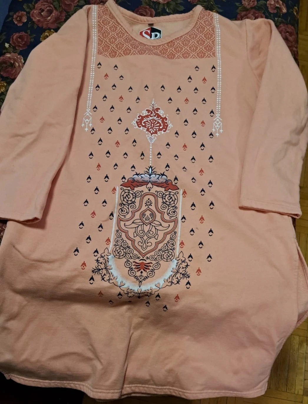 Peach colour top with decorative print. Crew neck and long sleeves. Made for comfort and style, this top's perfect for everyday wear.