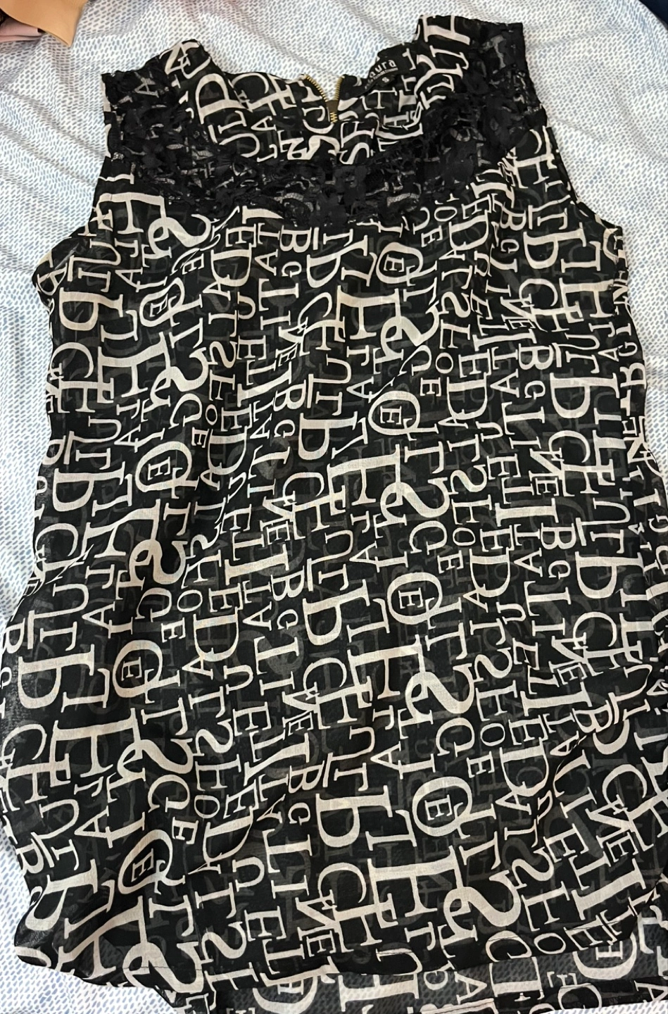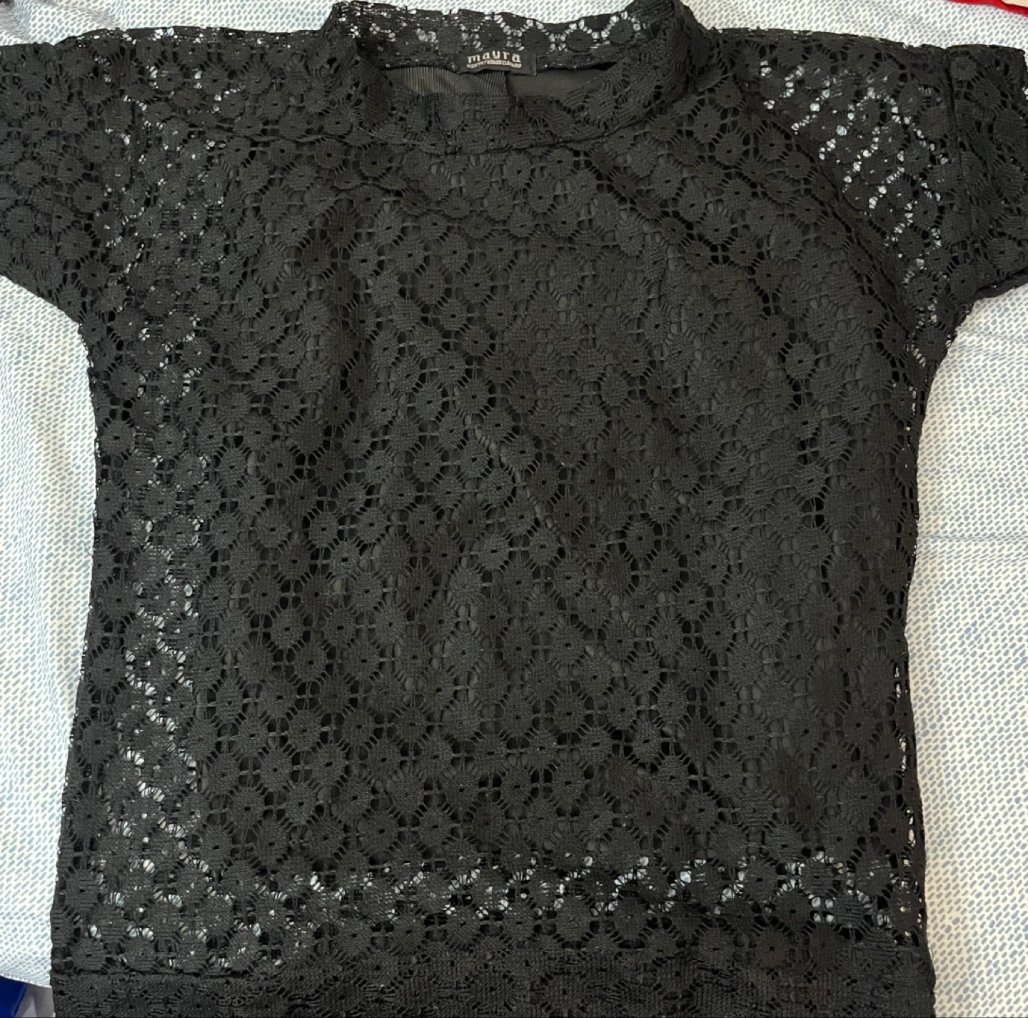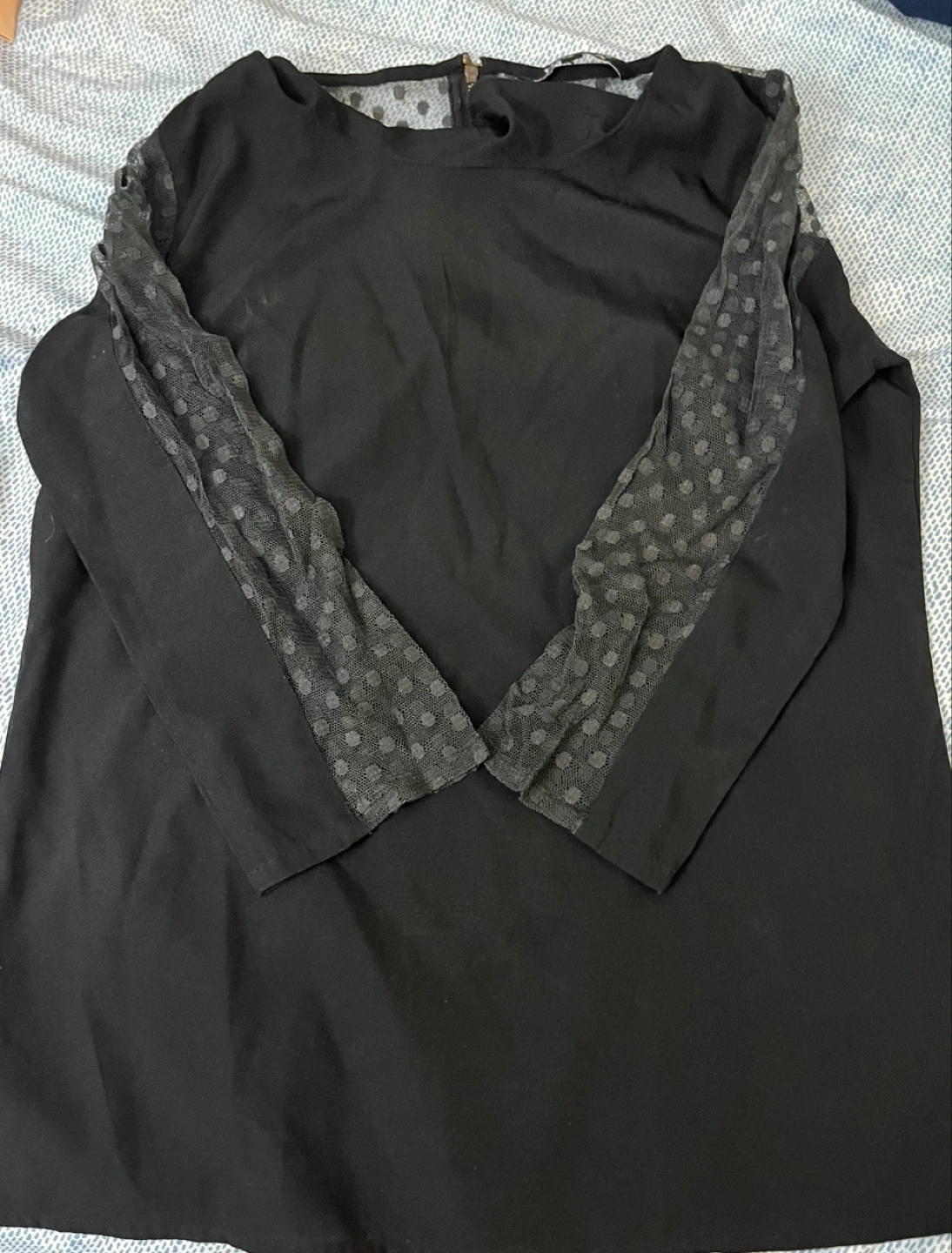 Five women's blouses in various colours and styles. Includes a white sheer blouse with black bow, a peach ribbed top with lace sleeves, a black and white patterned top, a black top with polka dot sleeves, and a black lace top. All tops are in good condition. Cost is $1 each . Bundle it all