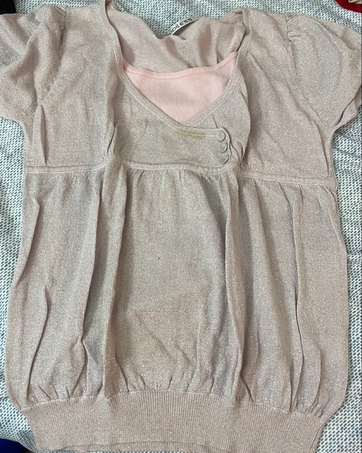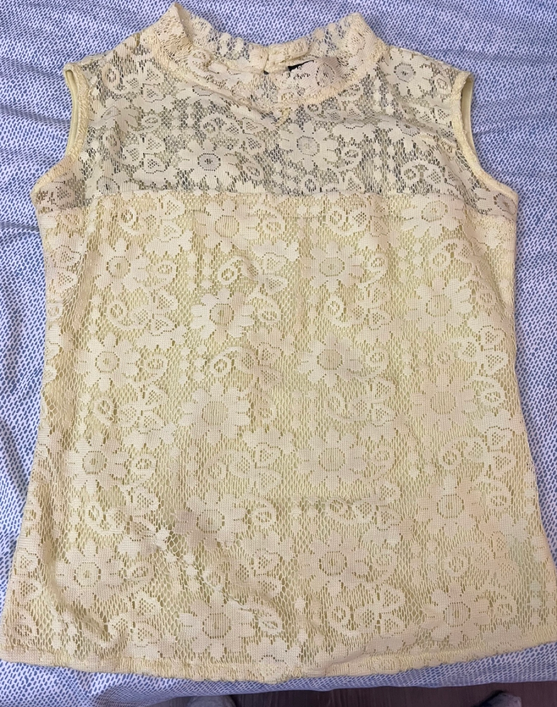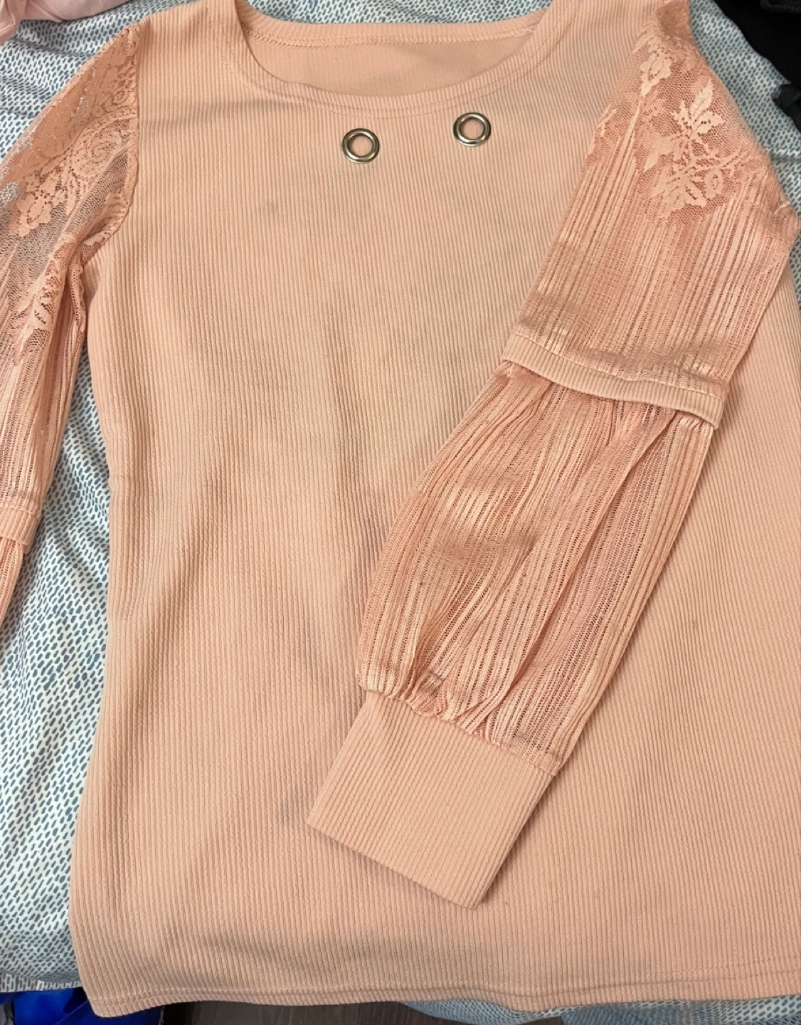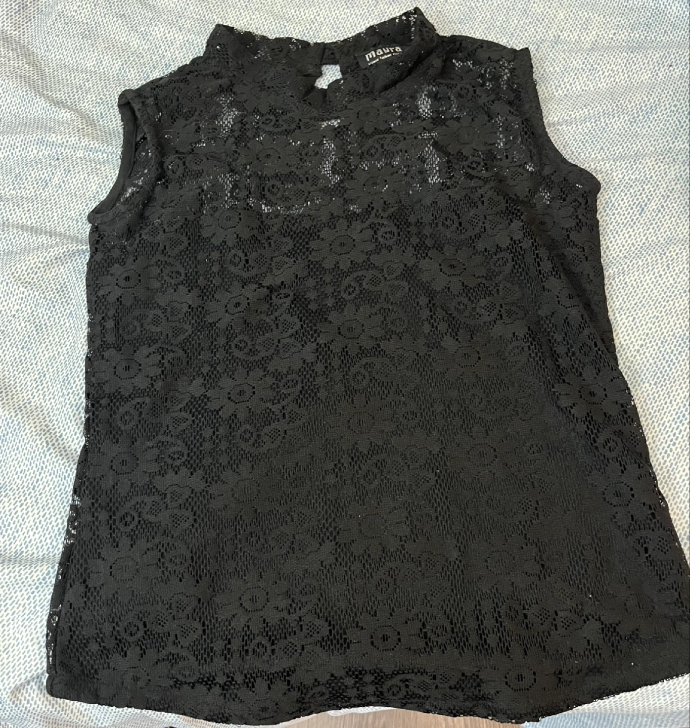 Five women's blouses in various colours and styles. Includes a white sheer blouse with black bow, a peach ribbed top with lace sleeves, a black and white patterned top, a black top with polka dot sleeves, and a black lace top. All tops are in good condition. Cost is $1 each . Bundle it all