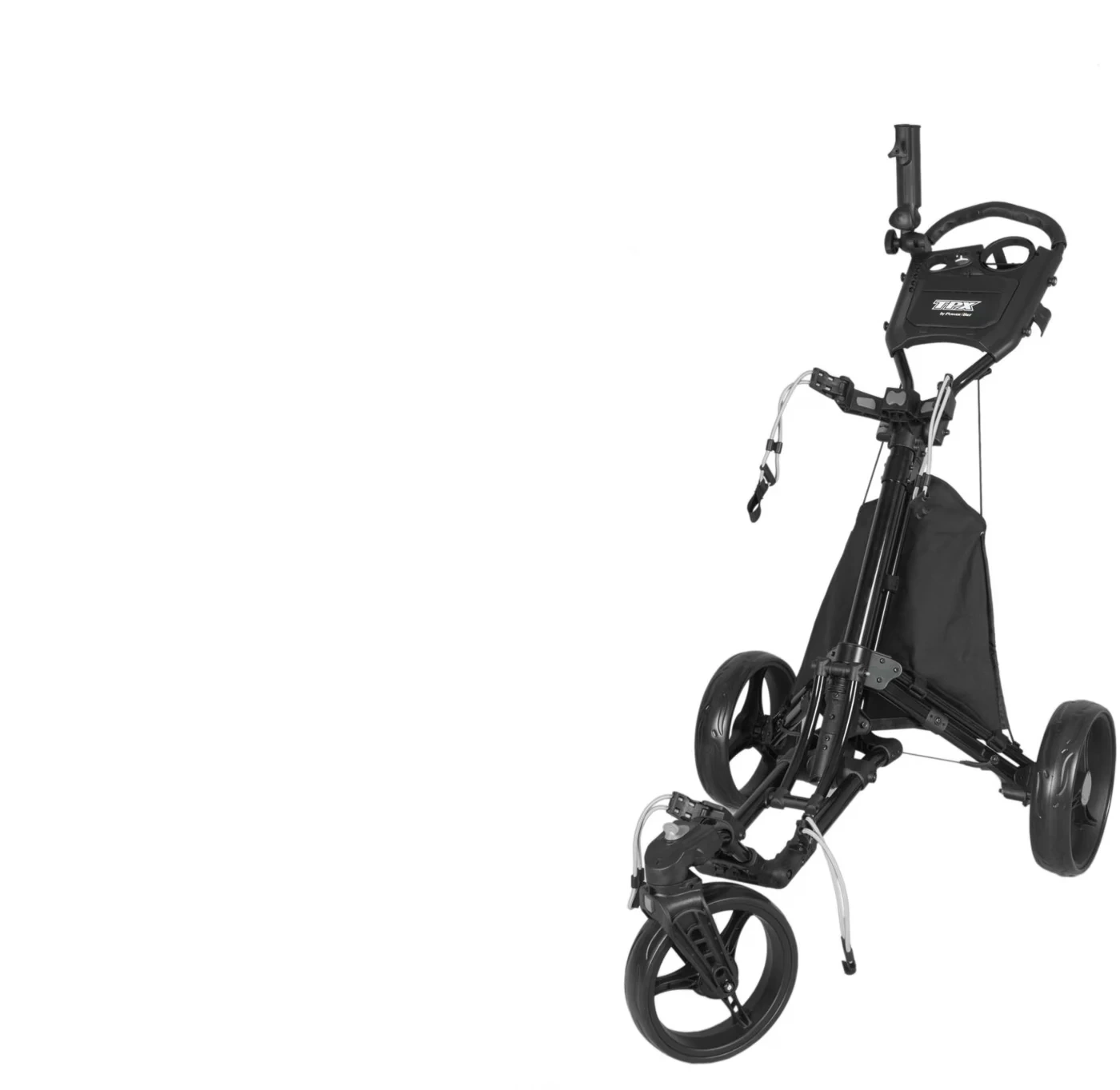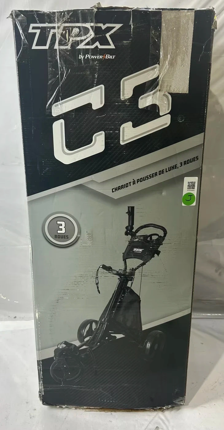 TPX by PowerBilt C3 golf push cart. This is a deluxe 3-wheel model. It's black and made for easy transport of your golf clubs on the course. Great for carrying your bag around the fairway!