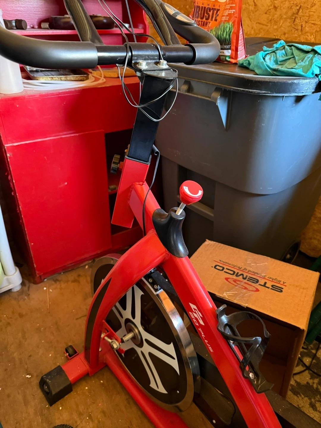 This red spin bike is perfect for your home gym. It features an adjustable seat and handlebars for a comfortable workout. Resistance knob included for customizable intensity. A water bottle holder is attached.