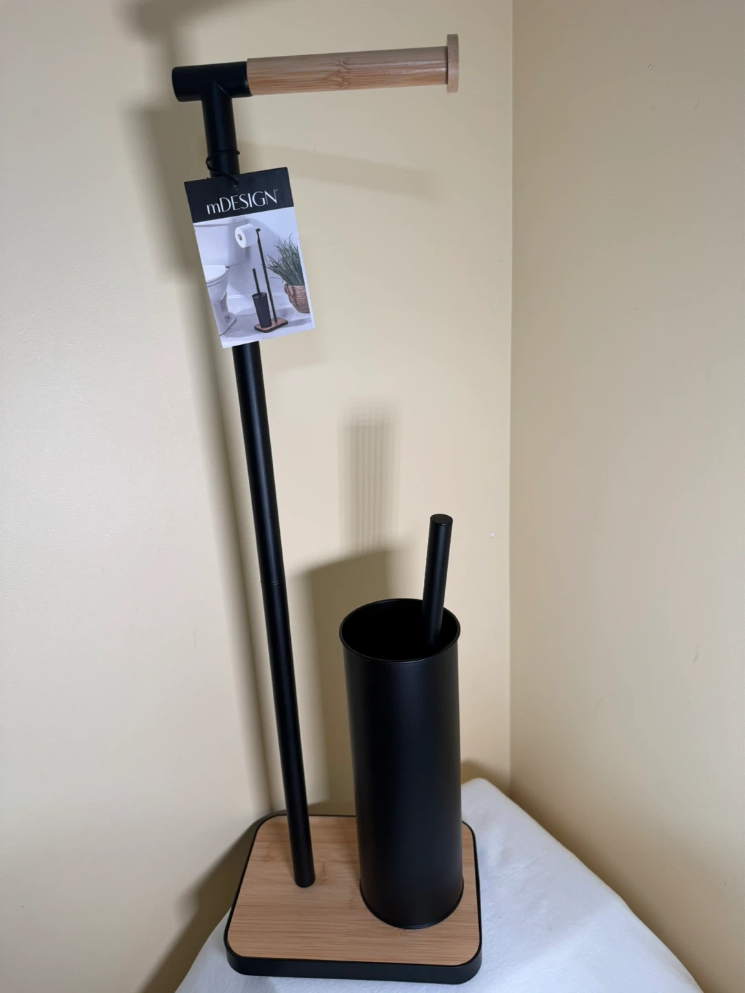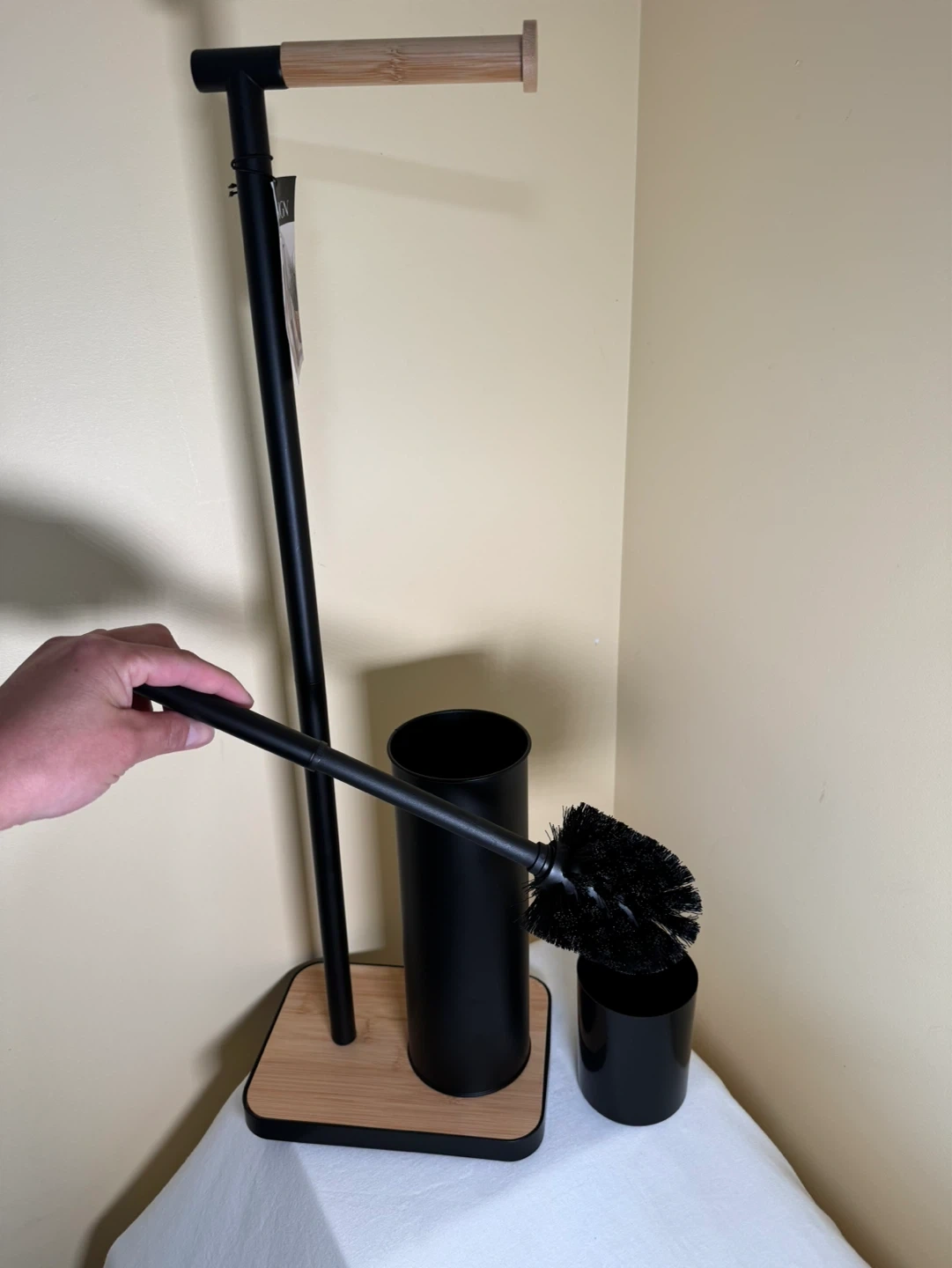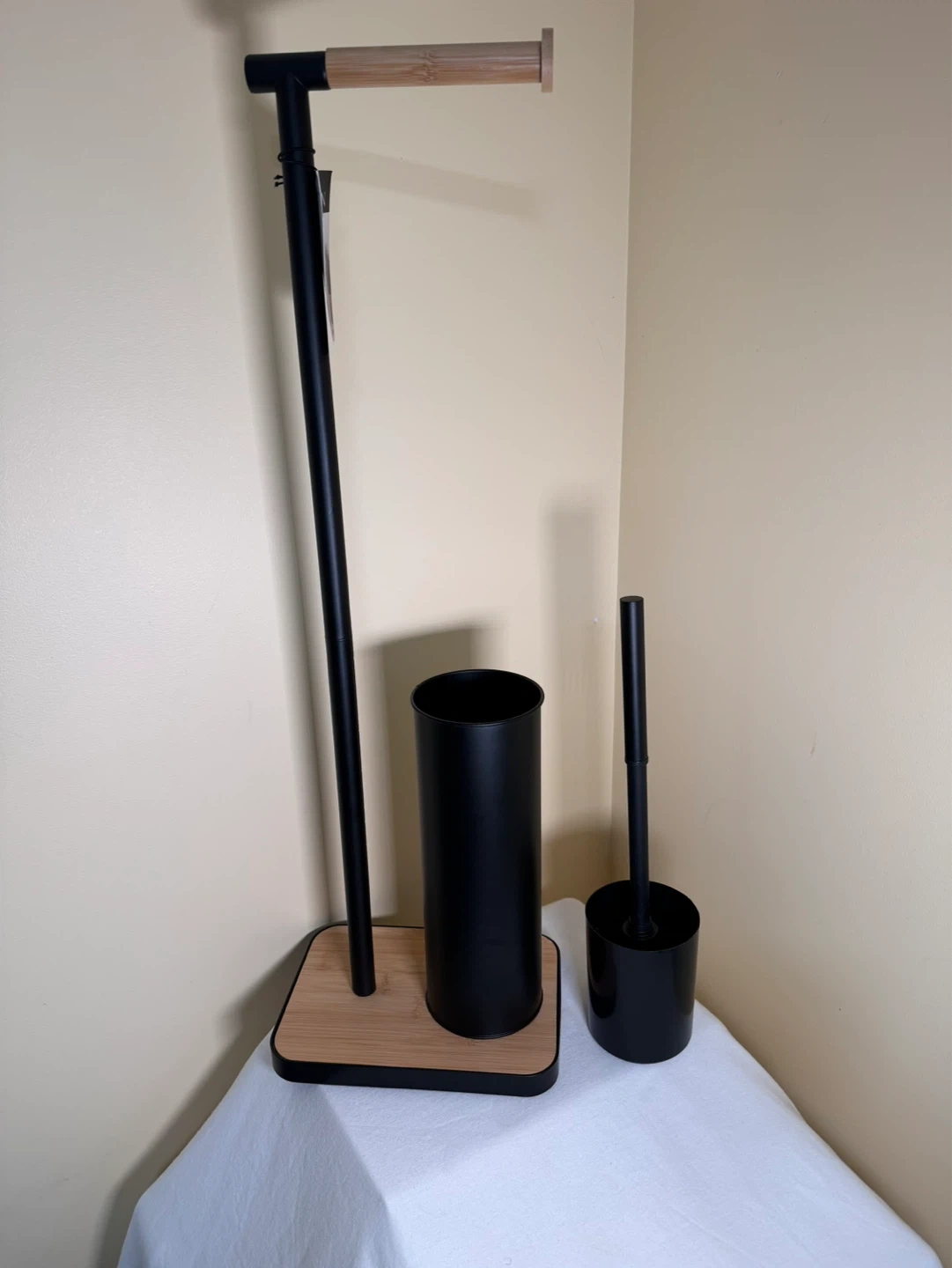 This toilet paper holder and brush set is made of black metal with bamboo accents. It's a convenient way to store extra toilet paper rolls and keep your brush handy. This set's compact design makes it suitable for bathrooms of all sizes.