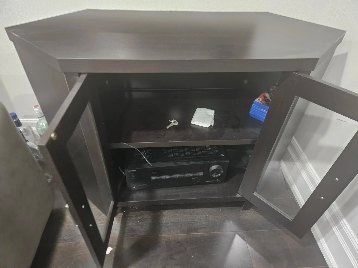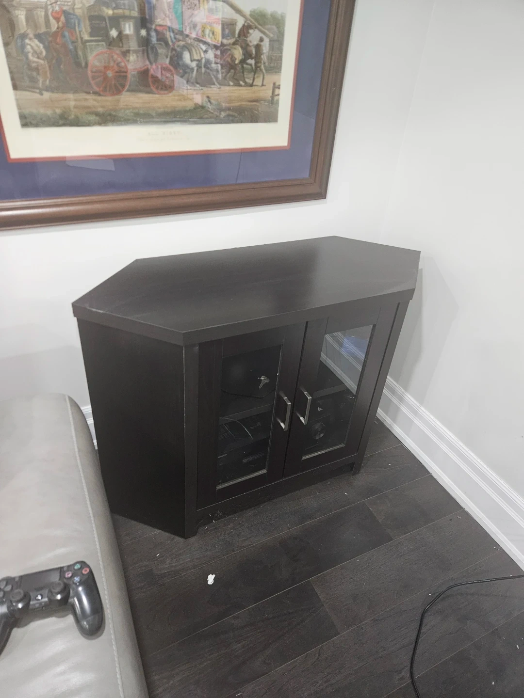 Selling a corner TV stand in dark brown. It's in good condition and perfect for saving space in a smaller room. Has two glass doors and a shelf for storage