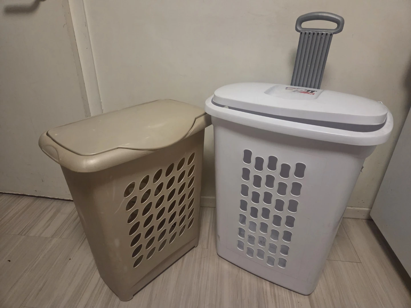 Two laundry baskets, one tan and one white. Both have lids and are made of plastic. They're great for storing and transporting laundry. They're a practical addition to any home!