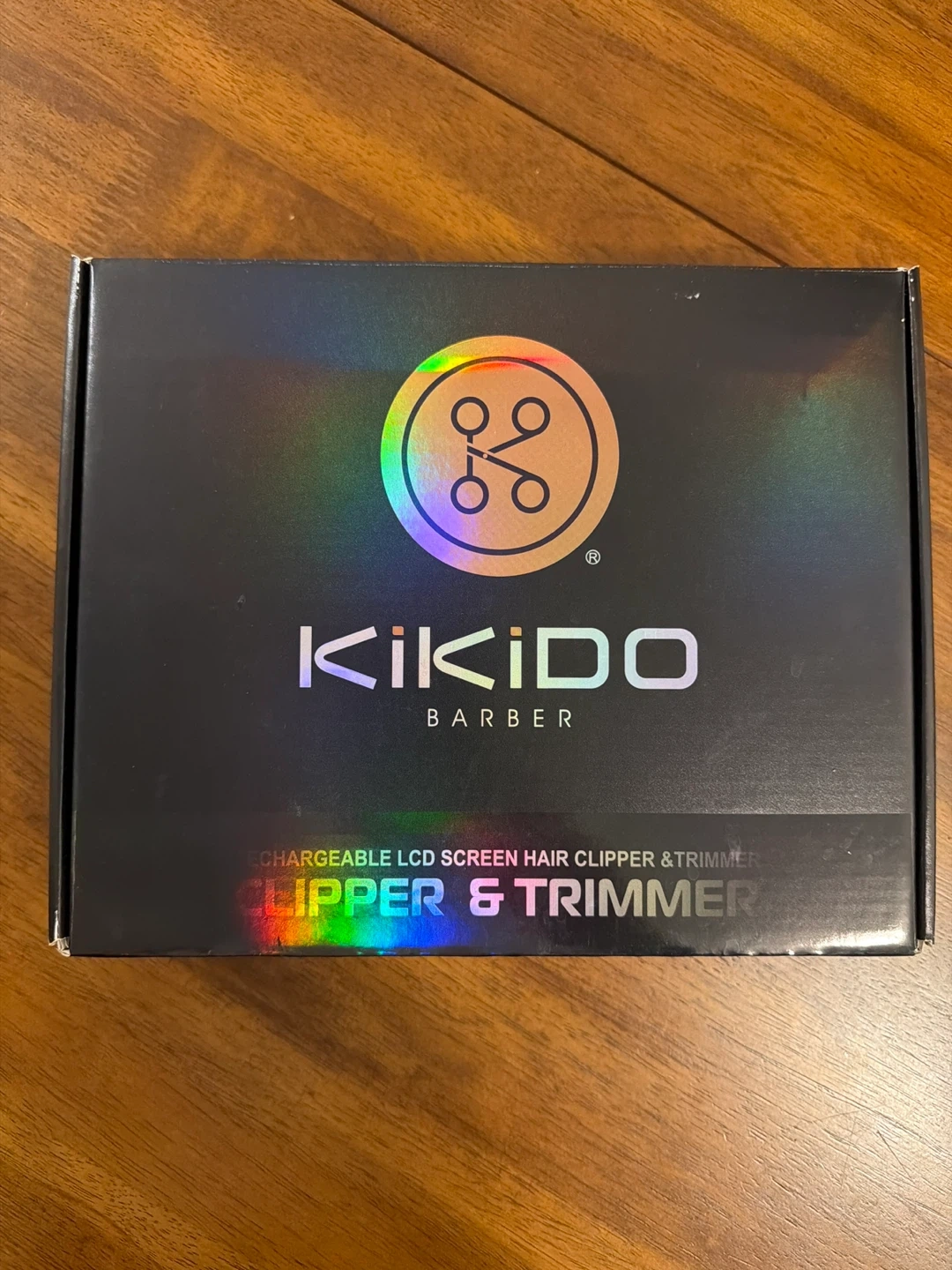 This is a KIKIDO BARBER rechargeable hair clipper and trimmer set. It features an LCD screen and comes with multiple guide combs. Includes the clipper, trimmer, and all accessories shown.