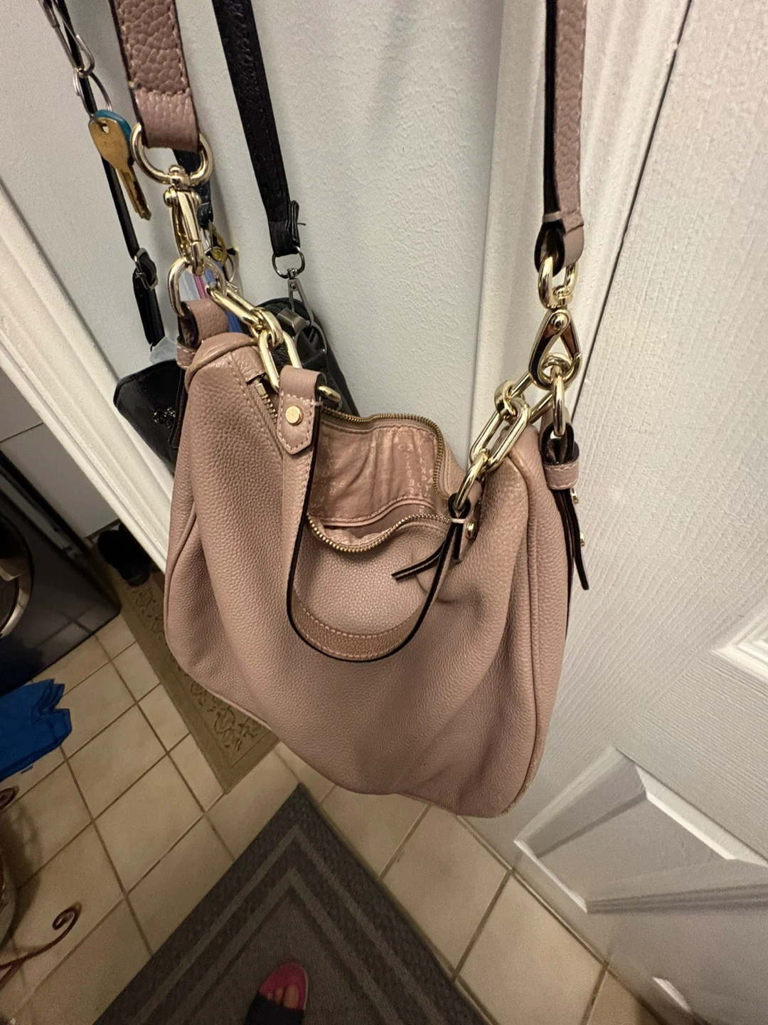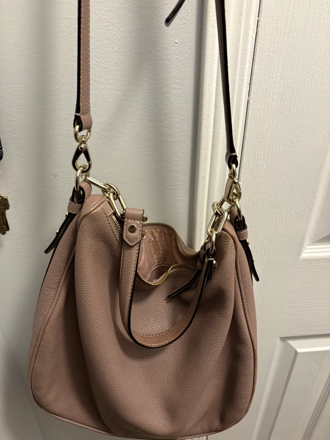 Selling a Kate Spade shoulder bag in light pink. It's in good condition and has a gold chain detail!