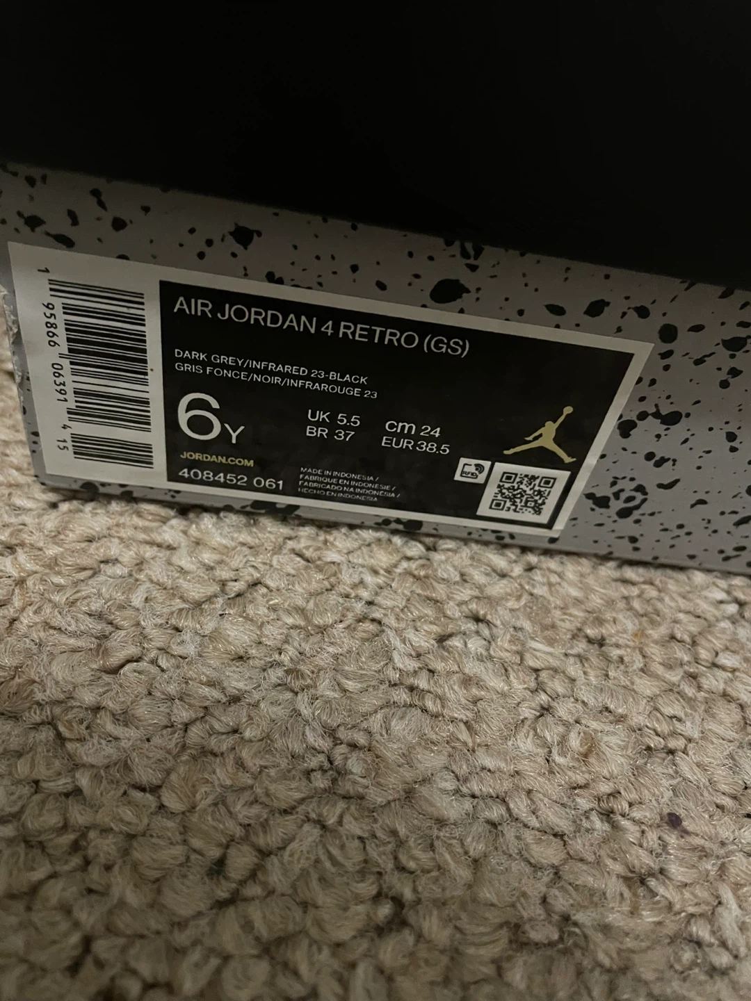 These are Air Jordan 4 Retro GS "Infrared" sneakers in dark grey and black. The size is 6Y, which is equivalent to a UK 5.5, EUR 37, or CM 24. They come in their original box.