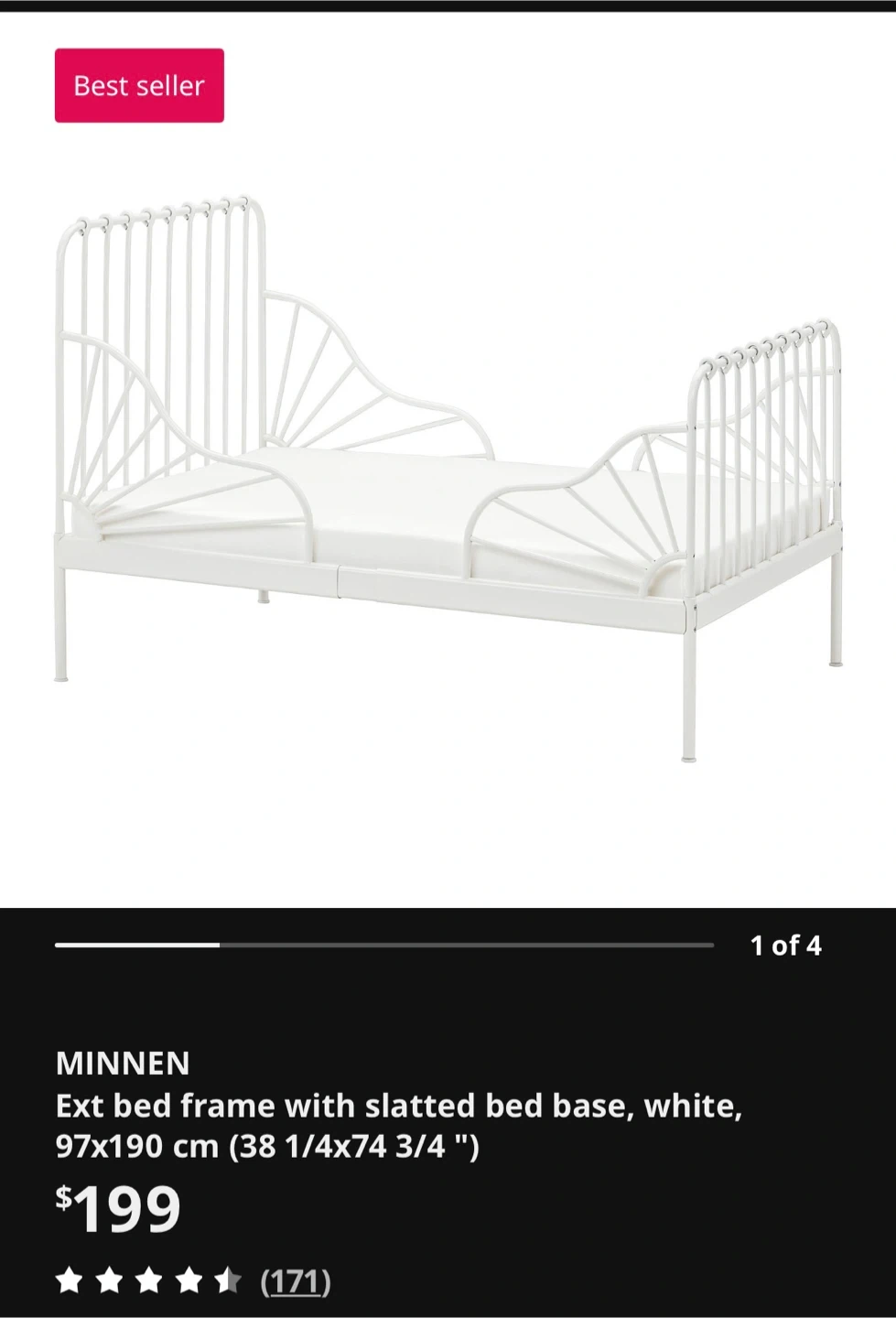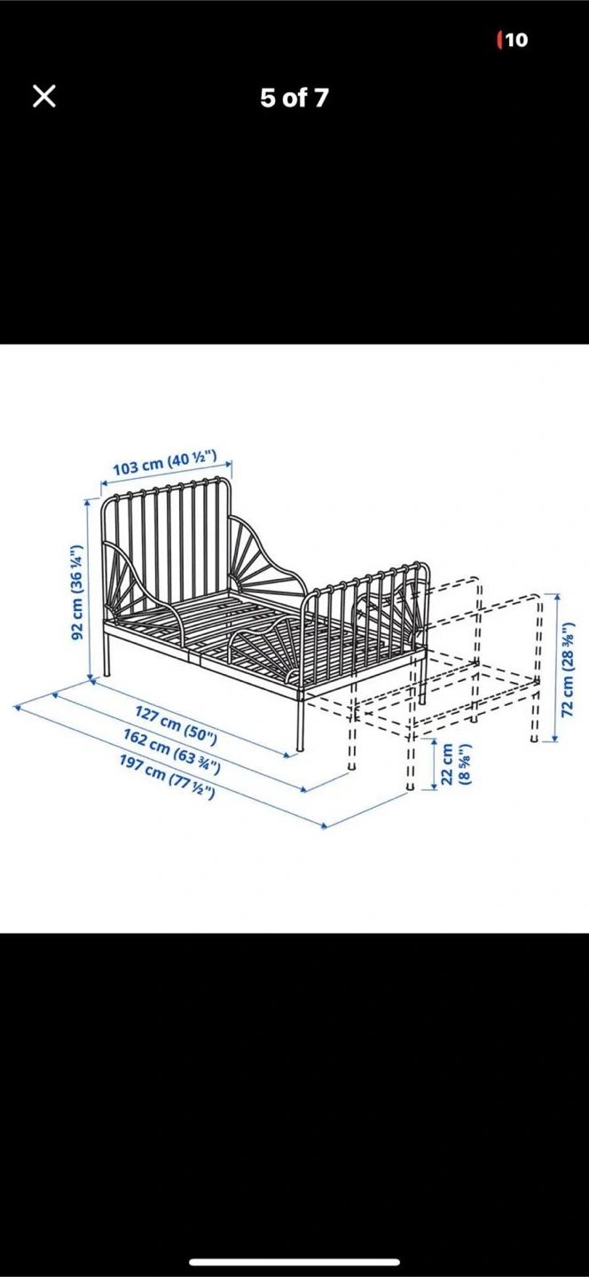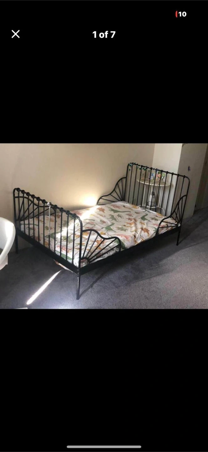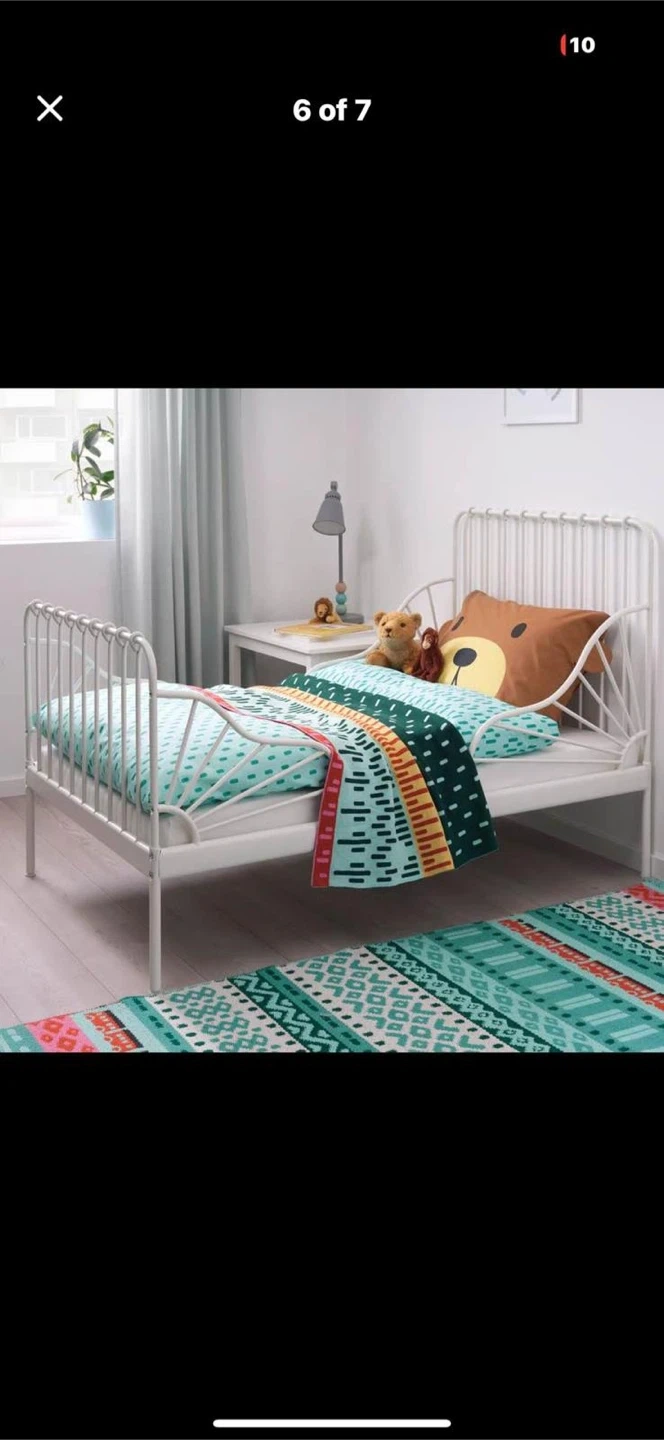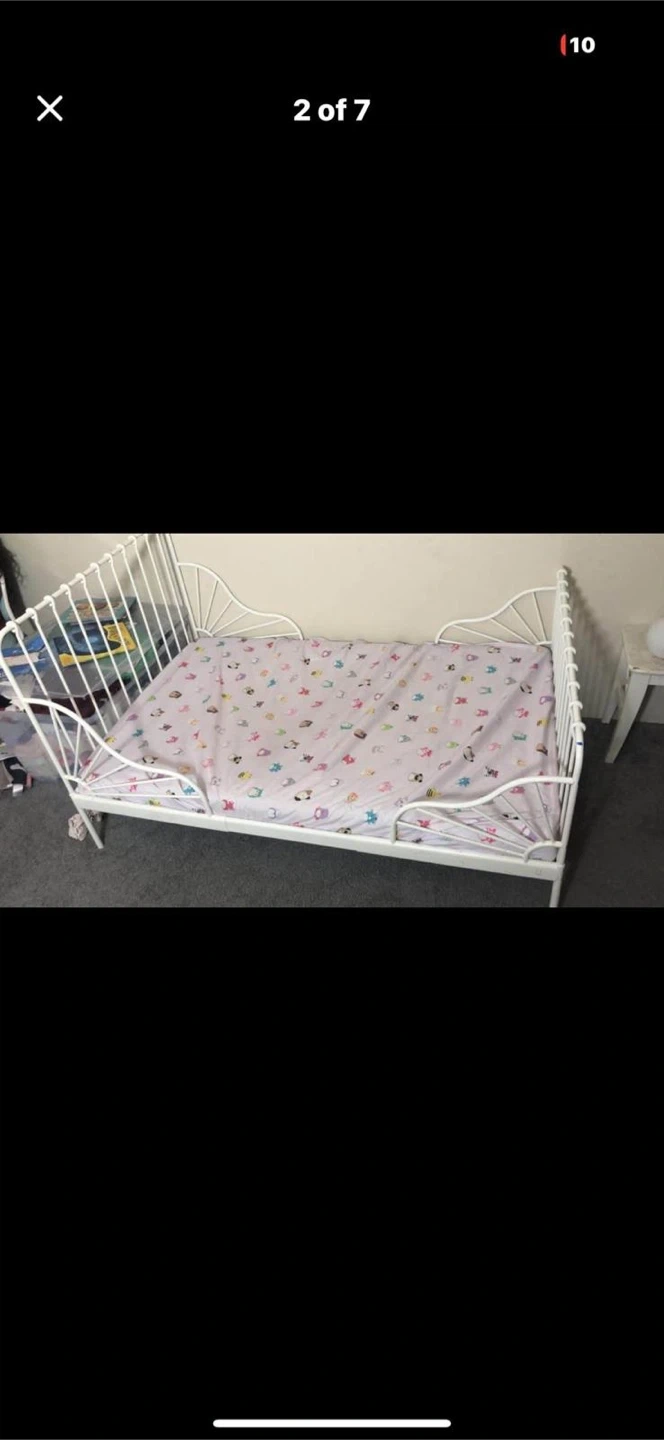 IKEA MINNEN extendable bed frame in white & black . It comes with a slatted bed base. This bed frame is suitable for children and can be adjusted as they grow and pickup from Burnaby
