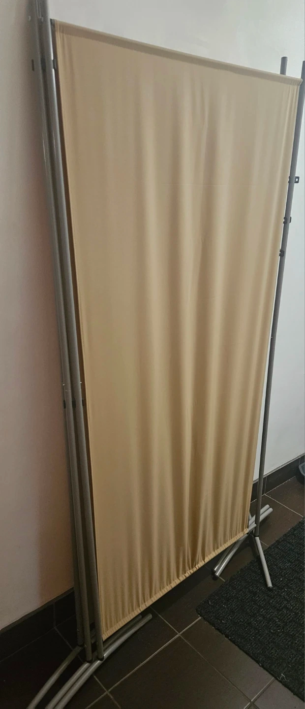 This four-panel room divider is beige with a metal frame. It's freestanding and can be easily set up to create privacy or divide spaces. Panels connect to upright poles with adjustable stands for stability.