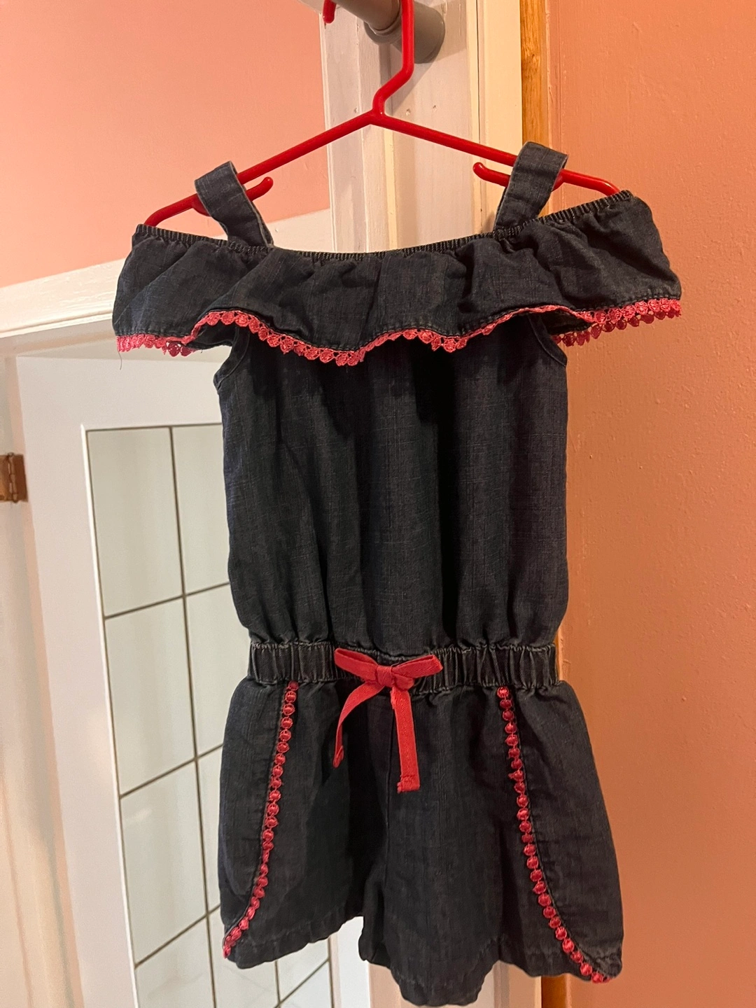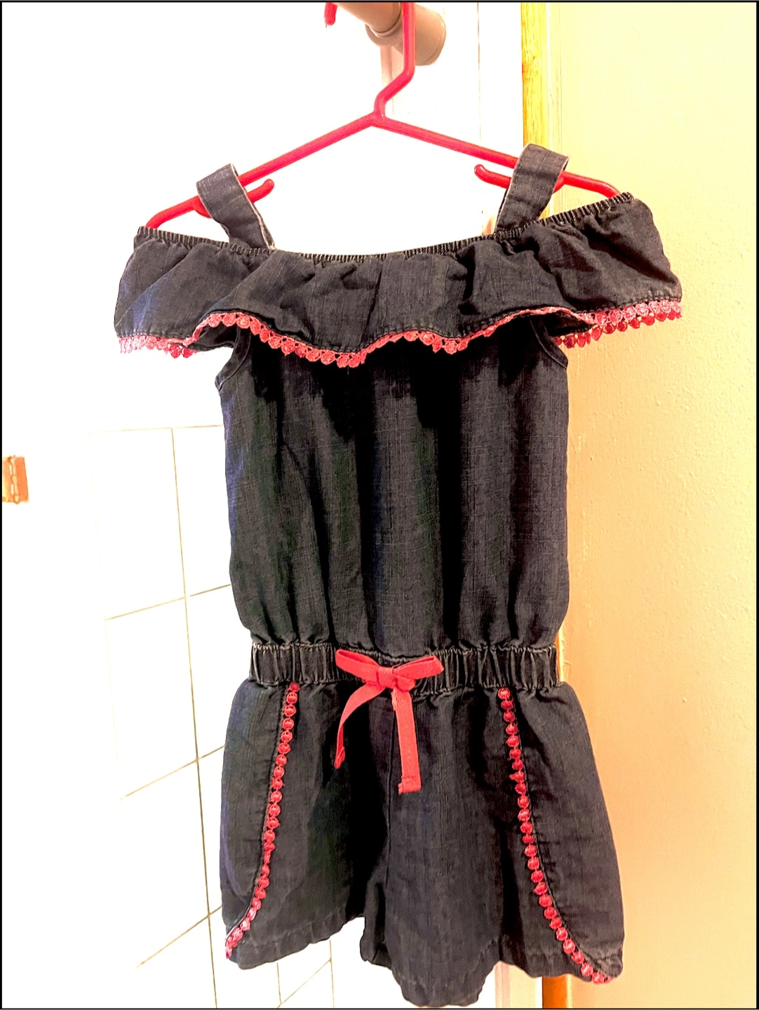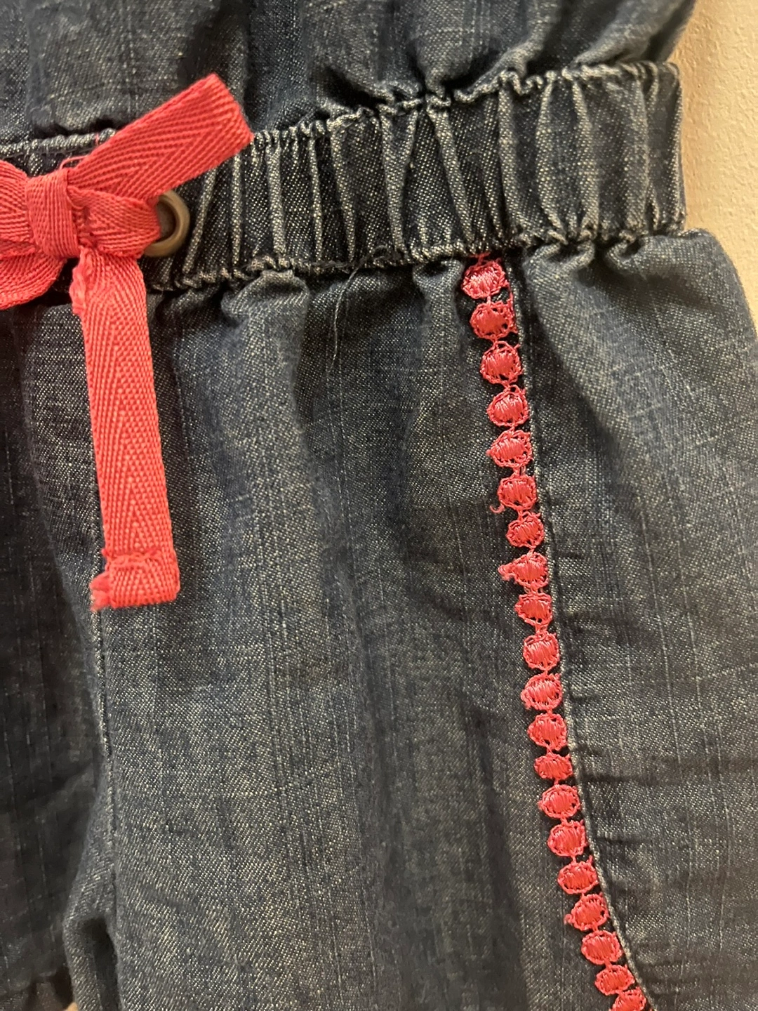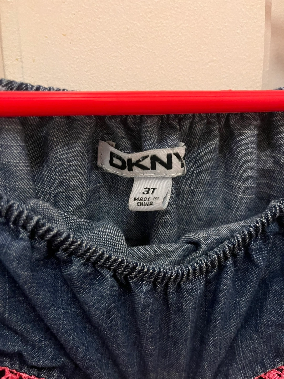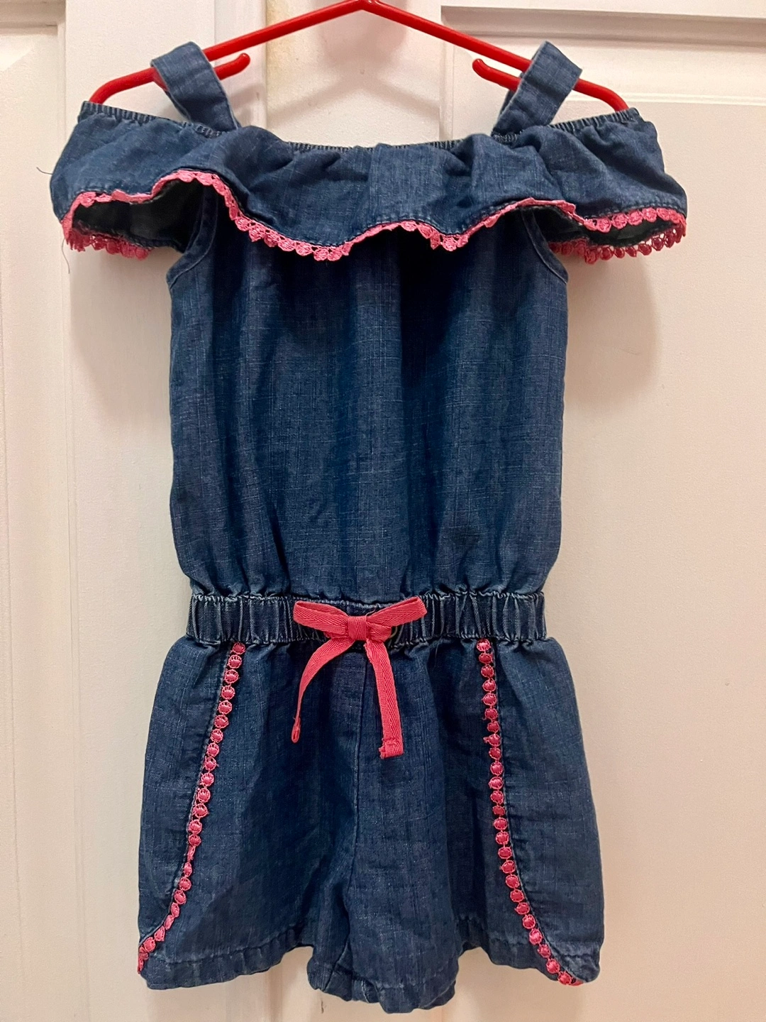 Adorable DKNY denim jumpsuit. Size 3T. Features off-the-shoulder ruffled sleeves, pink accents, and a drawstring waist. Great for summer.