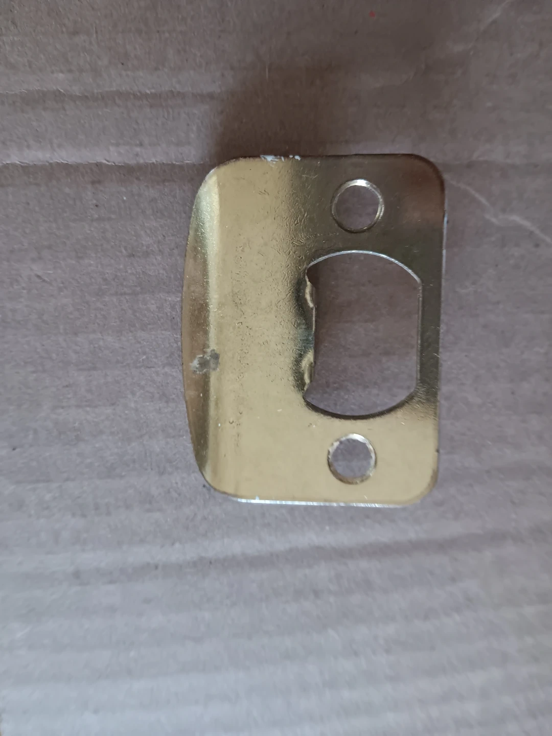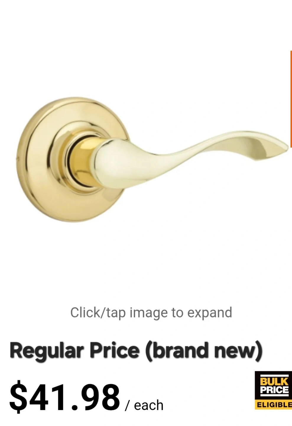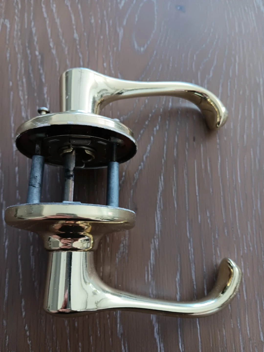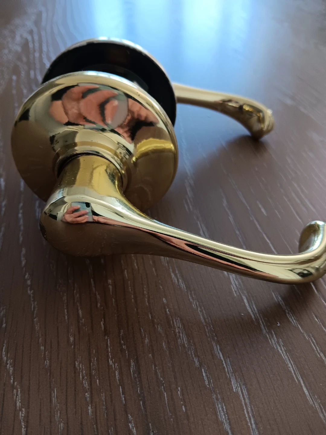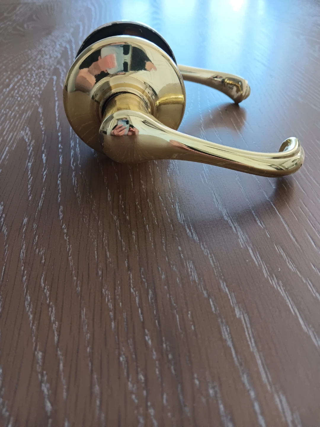 This is a gold-coloured door lever handle set. It's made of metal and comes with a strike plate. Great for replacing old door hardware! Approximately 10 handles in box.